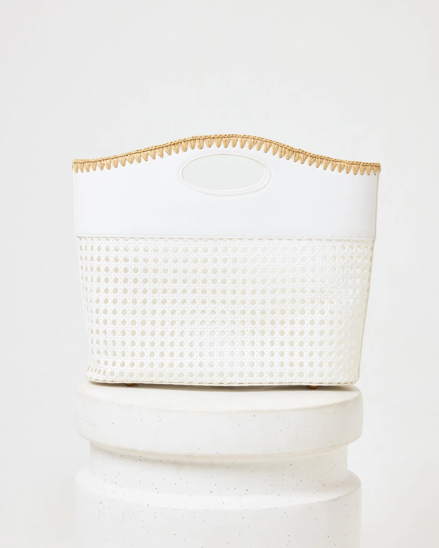 The Casablanca is our super-special take on an oversized clutch. Thoughtful details including a paper raffia woven stitch on top and a cream colored open-weave body makes this purse perfect for elevating your everyday outfit. - Oversized clutch - Faux leather handle - Paper raffia stitch design - Material: 100% Paper - Style # LSCSB24