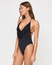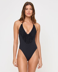 Guess who's back, back again?! Fringe is back, tell a friend. The Desert Days One Piece brings our iconic fringe to the forefront of your next swim look. Featuring classic coverage, a super-deep v-front and ties at the neck and back -- there's no doubt you will feel your best when rockin' this one. Bonus points -- she doubles as a bodysuit when paired with denim. - Deep V - Tie at neck - Tie at back - Classic coverage - Fringe at bust - Classic Coverage - Size XS-XL - 82% Nylon, 18% Spandex - Style # LSDEMC25 FIT - Coverage: Classic - Model Measurements: Jocelyn, size S - Height 5’9”, Bust 32", Waist 24", Hips 34"