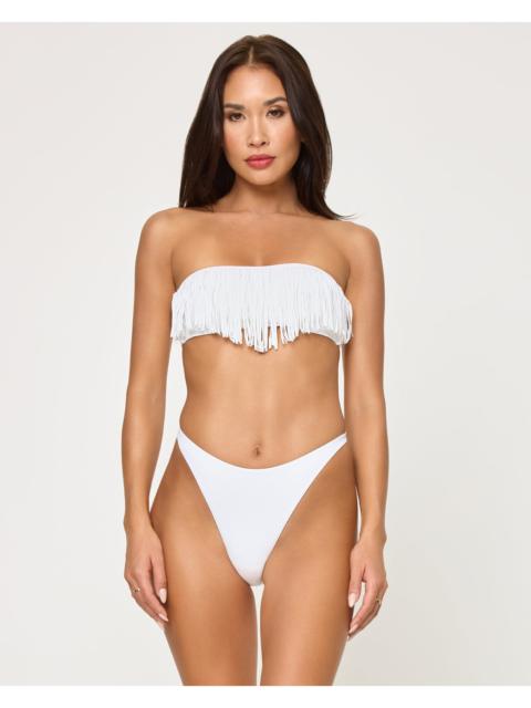 The Dixie Top is a strapless bandeau bringing sexy back thanks to its nostalgic fringe at the bust. You'll be able to shimmy and shake in this iconic bikini that features removable pads and back tie. - Bandeau Top - Tie at back - Fringe at bust - Removable Padding - Size XS-XL - 82% Polyester | 18% Spandex - Style # LSDIT25 FIT - Coverage: Minimal - Support: Minimal - Model Measurements: Lura, size S - Height 5'9, Bust 32", Waist 24", Hips 34"