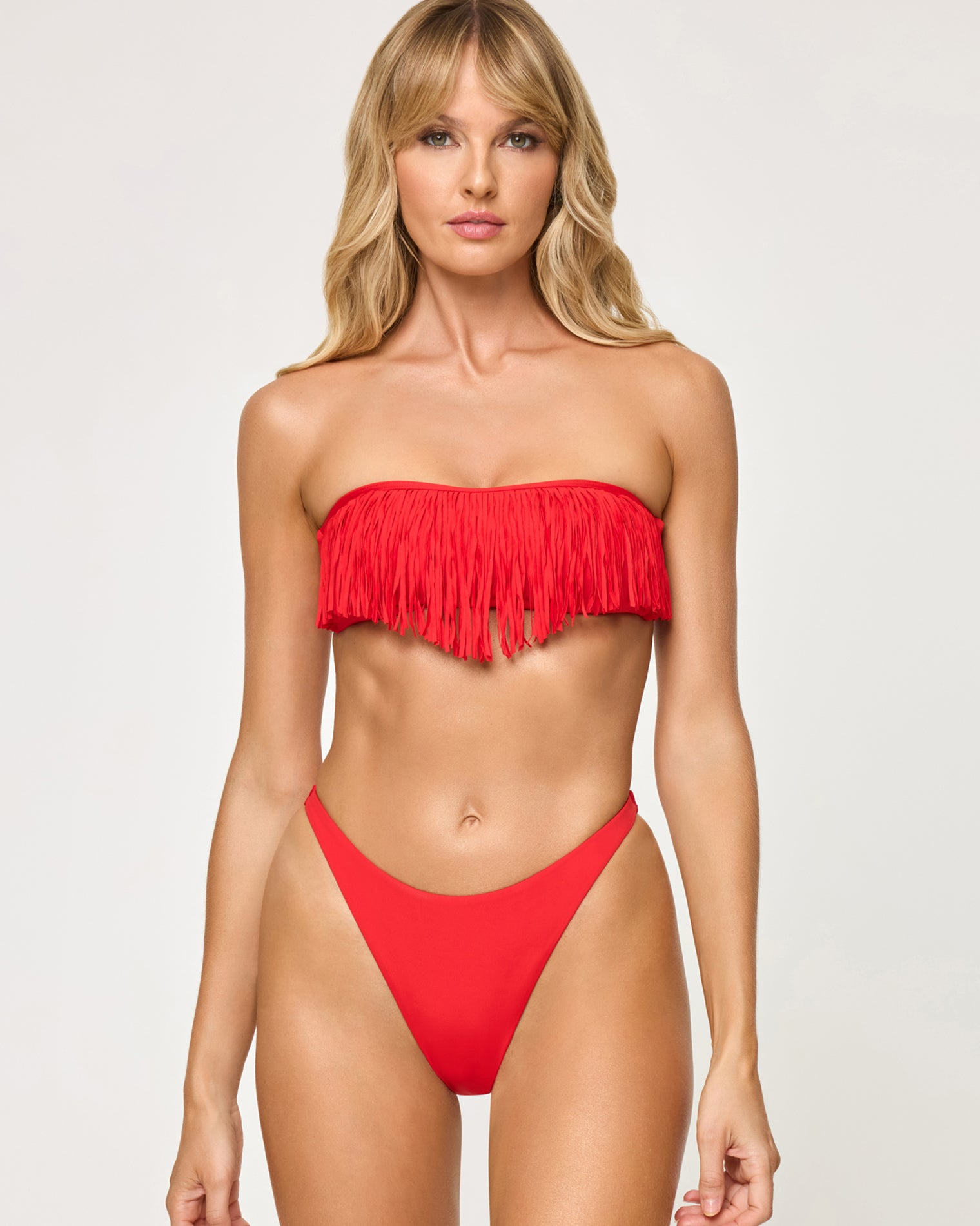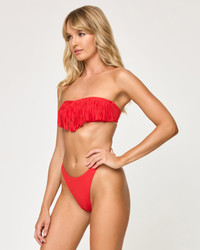 The Dixie Top is a strapless bandeau bringing sexy back thanks to its nostalgic fringe at the bust. You'll be able to shimmy and shake in this iconic bikini that features removable pads and back tie. - Bandeau Top - Tie at back - Fringe at bust - Removable Padding - Size XS-XL - 82% Polyester | 18% Spandex - Style # LSDIT25 FIT - Coverage: Minimal - Support: Minimal - Model Measurements: Lura, size S - Height 5'9, Bust 32", Waist 24", Hips 34"