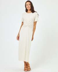Looking for a dress that you can throw on and go? We found her! The Drew Dress is a midi-length short-sleeve t-shirt style dress with a twist at front to add some spice. A leg slit also ups the appeal. Choose from three neutral colorways. - Ankle Length Dress - Short Sleeve - Cuffed Sleeve - Relaxed Fit - Leg Slit - Twist at Front - Size XS-XL - 100% Cotton - Like all delicates, shape, color and fit are best preserved if hand washed in cold water. Lay flat to dry. - Style # DREDR24 FIT - Model Measurements: Emily, size S - Height 5'9 1/2, Bust 34", Waist 25", Hips 35"