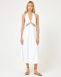 Things are lookin' pretty in poplin with the Eliza Dress. A halter-tie neckline lends a sexy sophistication and ruching on the back, gold metal hardware details and front cut-outs round things out. This midi feels luxe and substantial thanks to the slip lining. - U Front Hardware - Halter Neck - Maxi Dress - Poplin - 45% Viscose, 38% Cotton, 17% Linen - Style # ELIDR25 FIT - Model Measurements: Lura, size S - Height 5'9, Bust 32", Waist 24", Hips 34"