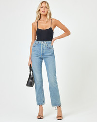 Sophisticated, clean and classic, the Holly One Piece offers a modern take on swimwear with its elongated neckline and effortless silhouette. Crafted from our "Ridin' High Rib" fabric that is soft and smoothing, this one can be worn as a body suit, too. - Scoop front - Spaghetti Strap - Adjustable Straps - Low Back - High Leg - Classic coverage - Size XS-XL - 80% Nylon, 20% Spandex - Style # RHHOMC24 FIT - Coverage: Classic - Model Measurements: Lura, size S - Height 5'9, Bust 32", Waist 24", Hips 34"