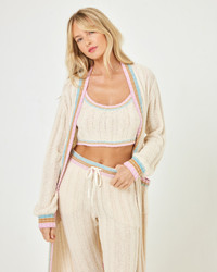 You'll be super cozy in the Ivy Duster. This ankle-length sweater will have you wrapped in warmth thanks to its self tie waist, ribbing at the cuff and neckline and a colorblock hem. Pair it with the matching joggers and tank for a pulled together lounge look. - Ankle L - ength Duster - Self Tie Waist - Rib At Cuff and Neckline - Colorblock Hem - Size XS/S, M/L - 68% Cotton, 32% Nylon - Like all delicates, shape, color and fit are best preserved if hand washed in cold water. Lay flat to dry. - Style # IVYSW24 - Model Measurements: Lura, size S - Height 5'9, Bust 32", Waist 24", Hips 34"