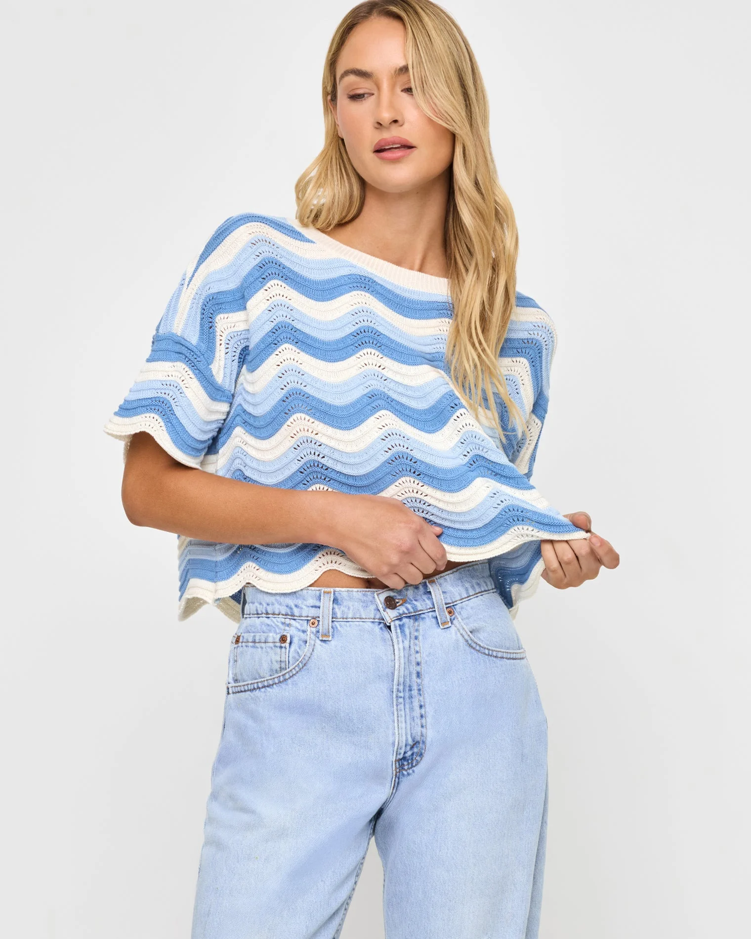 Have fun with playful knits. The Make Waves Top is an over sized boxy top with dropped shoulder and scalloped hem, and is the perfect throw on for any casual activity you’ve got planned. - Revolve Exclusive - Wide boxy cropped silhouette - Scalloped hem - Drop shoulder - Sweater knit - Size XS-XL - 100% Cotton - Like all delicates, shape, color and fit are best preserved if hand washed in cold water. Lay flat to dry. - Style # MAKSW24 FIT - Model Measurements: Jessica, size S - Height 5’10”, Bust 32", Waist 25", Hips 35"