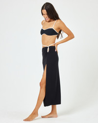 You know and love our ribbed dresses, and now we took your favorite fabric and made it into a cover-up. The Monae is a midi skirt with a high slit, loop at the waist and then an adjustable tie comes in above the waistband for a customizable fit. - Cover up - Midi length - High slit - Loop at waist - Adjustable tie above waistband - Size XS-XL - 88% Viscose 10% Cotton 2% Metallic - Style # MONSK24 FIT - Model Measurements:" - Emily, size S - Height 5'9 1/2, Bust 34", Waist 25", Hips 35"