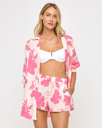 These linen pull-on shorts are the epitome of classic style and they're now available in our fun new animal print. An adjustable tie waist and pockets are just a few of the reasons we keep reaching for these closet staples. Pair them with the matching button-down tunic for a cute set that's perfect for the beach or brunch. - This style runs small, we recommend sizing up. - Linen Pull on Shorts - Adjustable Tie Waist - Side Pockets - 100% Linen - Style # RIOSH23 FIT - Model Measurements:" - Madison, size S - Height 5’9”, Bust 34", Waist 23 1/2", Hips 35"