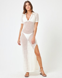 There's something about sweater knit fabric that just screams luxury. The Sydney Cover-Up combines glamour and refinement with its midi length, collar, v-neck, crochet short sleeves and perfectly-placed leg slit. - Midi Length - V Neck - Collared - Crochet - Short Sleeve - Slit At Thigh - Size XS-XL - 53% Cotton, 47% Polyester - Like all delicates, shape, color and fit are best preserved if hand washed in cold water. Lay flat to dry. - Style # SYDCV24 FIT - Coverage: Classic - Model Measurements: Maitlynn, size S - Height 5'9, Bust 34", Waist 24", Hips 35"