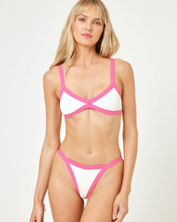 Our signature color blocking got a major revamp with the Taylor Bikini Top. This bralette is bringing maximum style with minimum coverage. Thick straps provide medium support while a cinched front showcases your beautiful curves. - Bralette - Thick Strap - Cinched In Front - Size XS-XL - 92% Nylon/8% Spandex - Style # RTYT24 FIT - Coverage: Minimum - Support: Medium - Model Measurements: Lura, size S - Height 5'9, Bust 32", Waist 24", Hips 34"