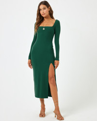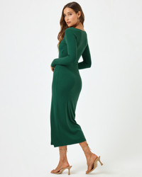 The Windsor dress is the perfect fit for your fall and winter plans. Its polished and refined long sleeves, square neck and leg slit make this dress easy to dress up or down depending on what fun events you have on your calendar. Available in festive emerald green or classic black. - Long Sleeve - Square Neckline - Ankle Length - Leg Slit - Built In Bra - Love Forever Rib - Size XS-XL - 90% Viscose 10% Elastane - Like all delicates, shape, color and fit are best preserved if hand washed in cold water. Lay flat to dry. - Style # WINDR24 FIT - Model Measurements: Anna, size S - Height 5'9, Bust 32", Waist 23", Hips 34.5"