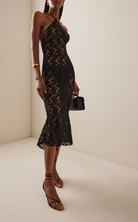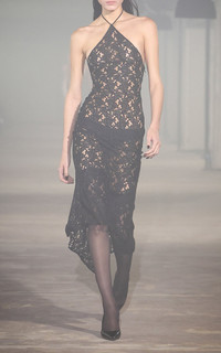 PRODUCT DETAILS - Slim fit, halter neckline, lace throughout, sheath silhouette with asymmetric hemline - Zip Fastening Through Back - Unlined - Composition: 36% Pl 64% Rayonne - Color: black - Dry Clean Only - Fall-Winter '25