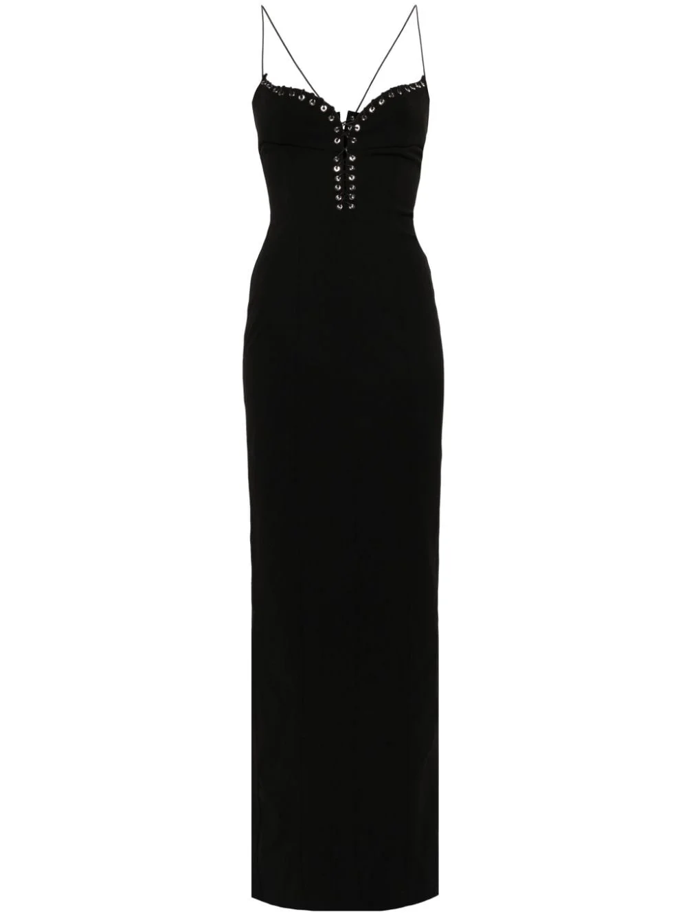 Cleavage crepe maxi dress Highlights - Black - Crepe texture - Panelled design - Criss-cross straps detail - Sweetheart neck - Adjustable spaghetti straps - Sleeveless - Concealed rear zip fastening - Rear slit - Floor-length - Straight hem - Unlined Made in France Composition Polyester 100% SIZE & FIT Model measurements Height 5 ft 11 in(1.8 m) Bust/Chest 32.67 in(83 cm) Hips 36.22 in(92 cm) Waist 24.4 in(62 cm) FittingInformation Designed for a close fit throughout Made from a midweight non-stretch fabric, this piece offers minimal elasticity when worn This piece fits true to size – take your usual size Measurement HIPS 30.98 in(78.7 cm) LENGTH 58.5 in(148.6 cm) WAIST 24.01 in(61 cm) BUST 29.01 in(73.7 cm)