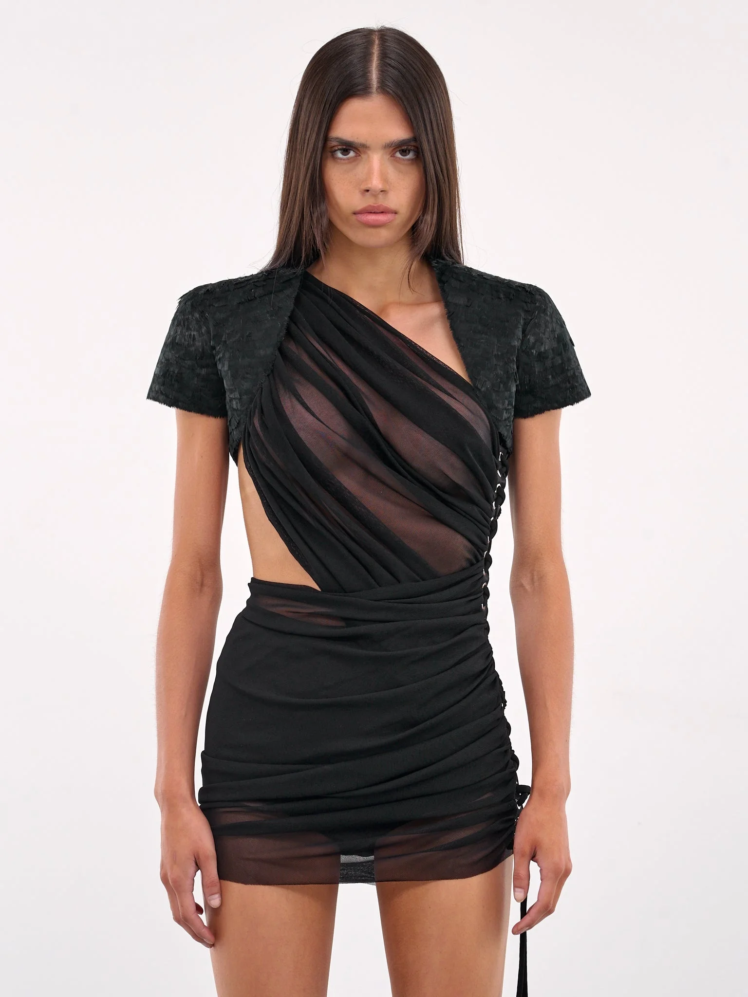 LUDOVIC DE SAINT SERNIN bolero in black, goose feather construction, rounded neck, open front, short sleeves, half back paneling, cropped length, slim fit. Made in France 100% Goose Feathers One Size Model is 5'8" wearing size OS. Bust: 32.5" Waist: 24" Hips: 34"