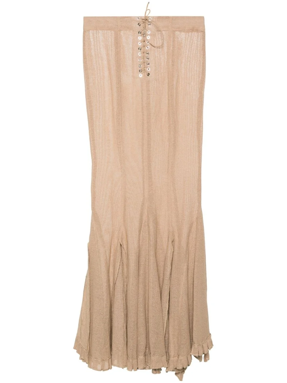 mermaid fishnet maxi skirt Highlights - Medium beige - Cotton blend - Fishnet knitted construction - Semi-sheer construction - Mermaid design - Low-rise - Floor-length - Multiple slits to the hem - Ruffle hem - Unlined - Front lace-up fastening Made in France Composition Cotton 70%, Polyester 30% SIZE & FIT Model measurements Height 5 ft 10 in(1.78 m) Bust/Chest 33.46 in(85 cm) Hips 36.22 in(92 cm) Waist 23.22 in(59 cm) FittingInformation This maxi-length skirt is intended to be worn low on the hips Made from a midweight non-stretch fabric This piece fits true to size – take your usual size Washing instructions Dry Clean Only