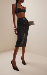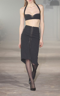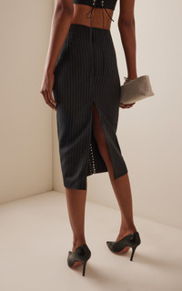 PRODUCT DETAILS - Slim fit, high rise, eyelet detailing up to the hemline, pinstripe printed throughout, pencil cut silhouette - Zip Fastening Through Back - Fully Lined - Composition: 52% Virgin Wool 43% Polyester 5% Elasthane - Color: stripe - Dry Clean Only - Fall-Winter '25
