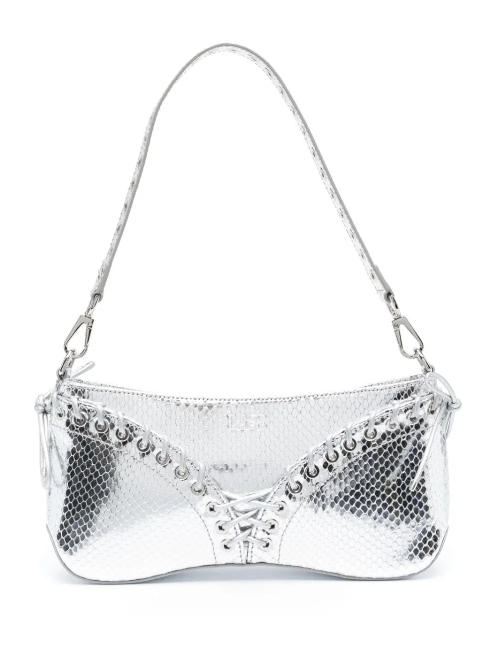 The Cleavage embossed leather shoulder bag The Cleavage bag spotlights Ludovic de Saint Sernin's affinity for lingerie-inspired designs. It's crafted from embossed leather and features lace-up detailing at the front that nods to classic corsetry. Highlights - Silver-tone - Lambskin - Metallic effect - Embossed finish - Metal eyelet detailing - Lace-up detailing - Debossed logo to the front - Silver-tone hardware - Top zip fastening - Detachable shoulder strap - Main compartment - Internal logo patch Made in France Composition Outer: Lamb Skin 100% SIZE & FIT Model measurements Height 5 ft 10 in(1.77 m) Bust/Chest 29.92 in(76 cm) Hips 34.25 in(87 cm) Waist 23.62 in(60 cm) Measurement DEPTH 1.96 in(5 cm) HANDLE 9.05 in(23 cm) HEIGHT 4.72 in(12 cm) WIDTH 9.84 in(25 cm)