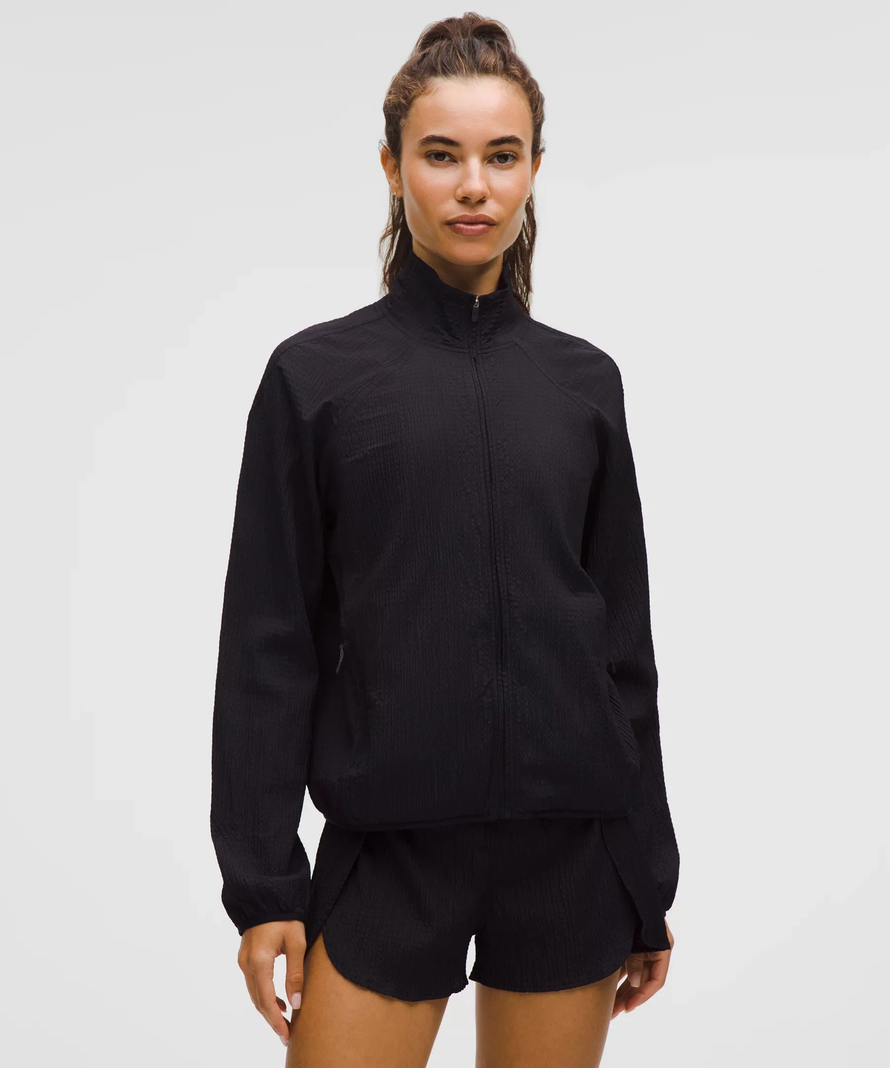 Designed for Running Ultralight, Soft Seersucker Fabric - Lightweight - Sweat-wicking - Quick-drying - Soft, textured feel - This product contains recycled polyester and nylon made from repurposed plastic waste Relaxed Fit, Hip Length - A loose fit with a little extra room - Sits below the waistband for moderate, everyday coverage Product Features - Zippered hand pockets with hidden phone sleeve - Locker loop for easy hanging Material and care Materials Lining: 86% Recycled Polyester14% Elastane - Body: 55% Recycled Nylon43% Nylon2% Elastane Care Machine Wash Cold - Do Not Bleach - Line Dry - Do Not Iron - Do Not Dry Clean - Wash With Like Colors