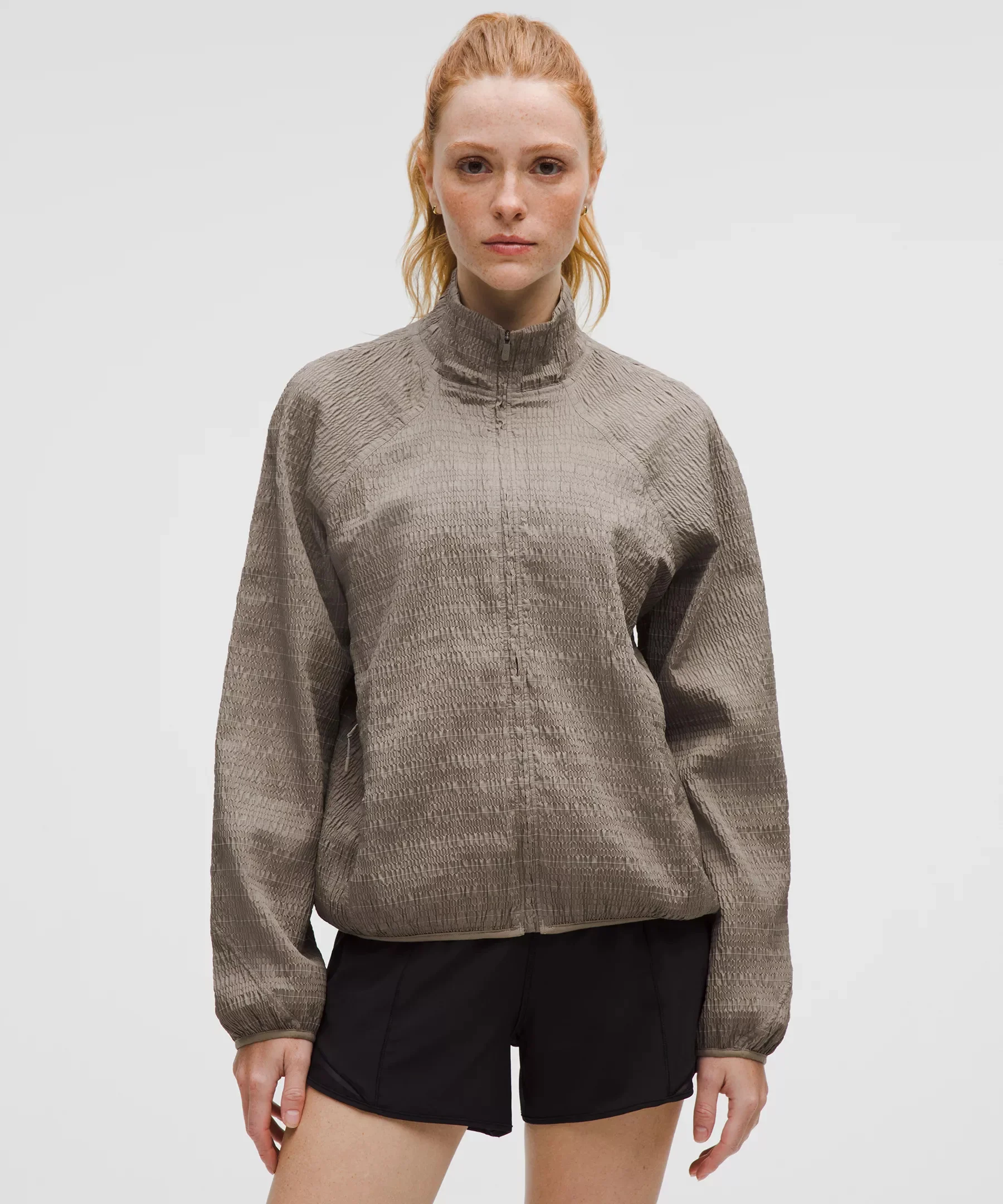 Designed for Running Reflective Seersucker Fabric - Lightweight - Sweat-wicking - Quick-drying - Reflective yarns knit throughout - This product contains recycled polyester made from repurposed plastic waste Relaxed Fit, Hip Length - A loose fit with a little extra room - Sits below the waistband for moderate, everyday coverage Product Features - Zippered hand pockets with hidden phone sleeve - Locker loop for easy hanging Material and care Materials Body: 84% Recycled Polyester9% Elastane7% Polyester - Lining: 86% Recycled Polyester14% Elastane Care Machine Wash Cold - Do Not Bleach - Line Dry - Do Not Iron - Do Not Dry Clean - Wash With Like Colors