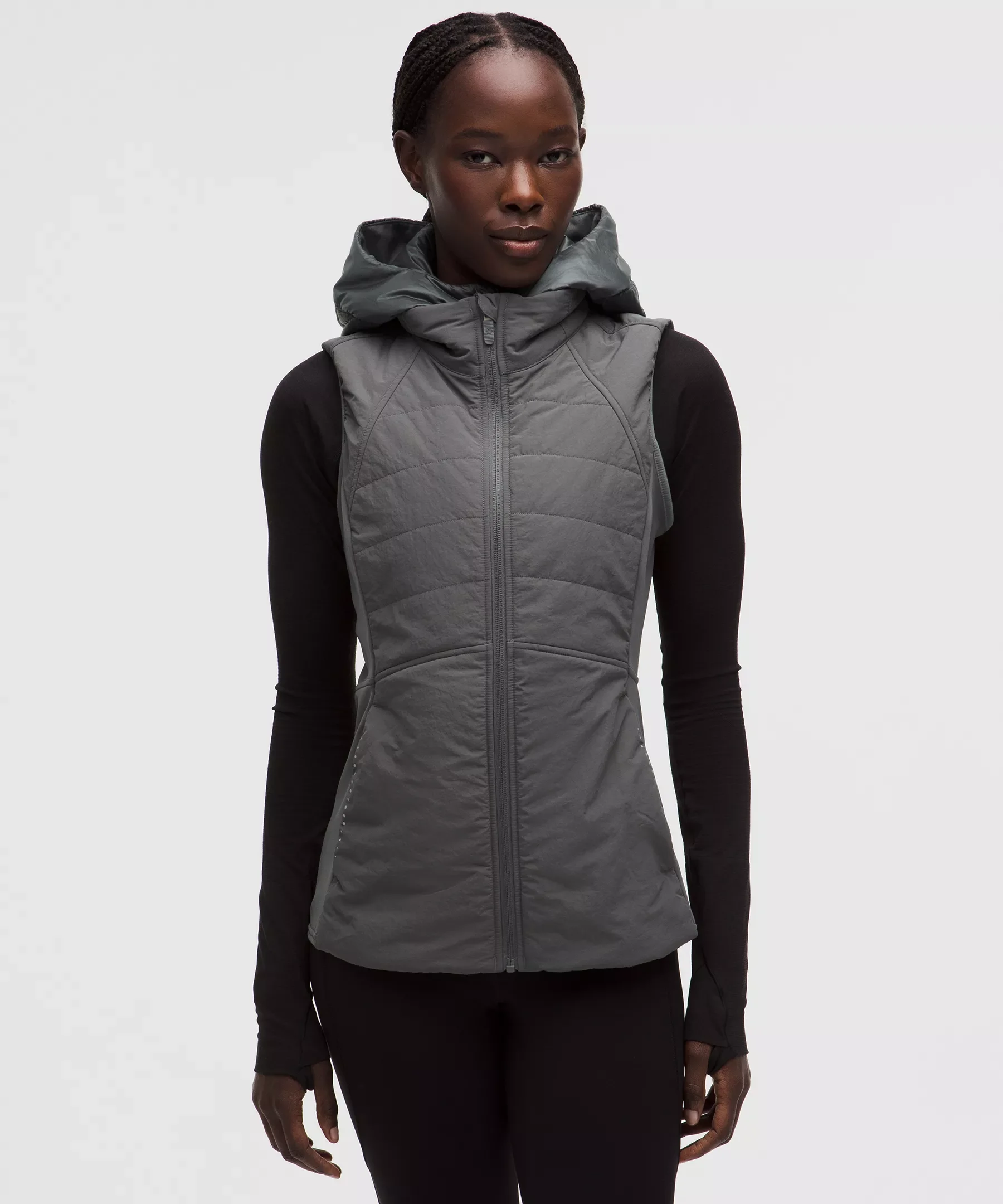 Designed for Running Water-Repellent, Glyde™ Fabric - Water-repellent - Windproof - PrimaLoft® insulation is warm, even when wet - Four-way stretch, breathable tech fleece fabric is DWR-treated to protect you from the elements Slim Fit, Hip Length - Slim fit skims your body Product Features - Removable dickie zips into inside of vest - Zippered exterior pockets with a hidden phone sleeve - Reflective details Material and care Materials Body Filling: 75% Polyester (recycled)25% Polyester - Body: 100% Nylon - Side Panels: 82% Nylon18% Lycra Elastane - Hood Filling: 75% Polyester (recycled)25% Polyester - Hood Lining: 100% Nylon - Hood Facing: 100% Polyester (recycled) - Hood: 100% Nylon - Lining: 100% Nylon Care Machine Wash Cold - Do Not Bleach - Tumble Dry Low - Do Not Iron - Do Not Dry Clean - Wash With Like Colors, Do Not Use Fabric Softener