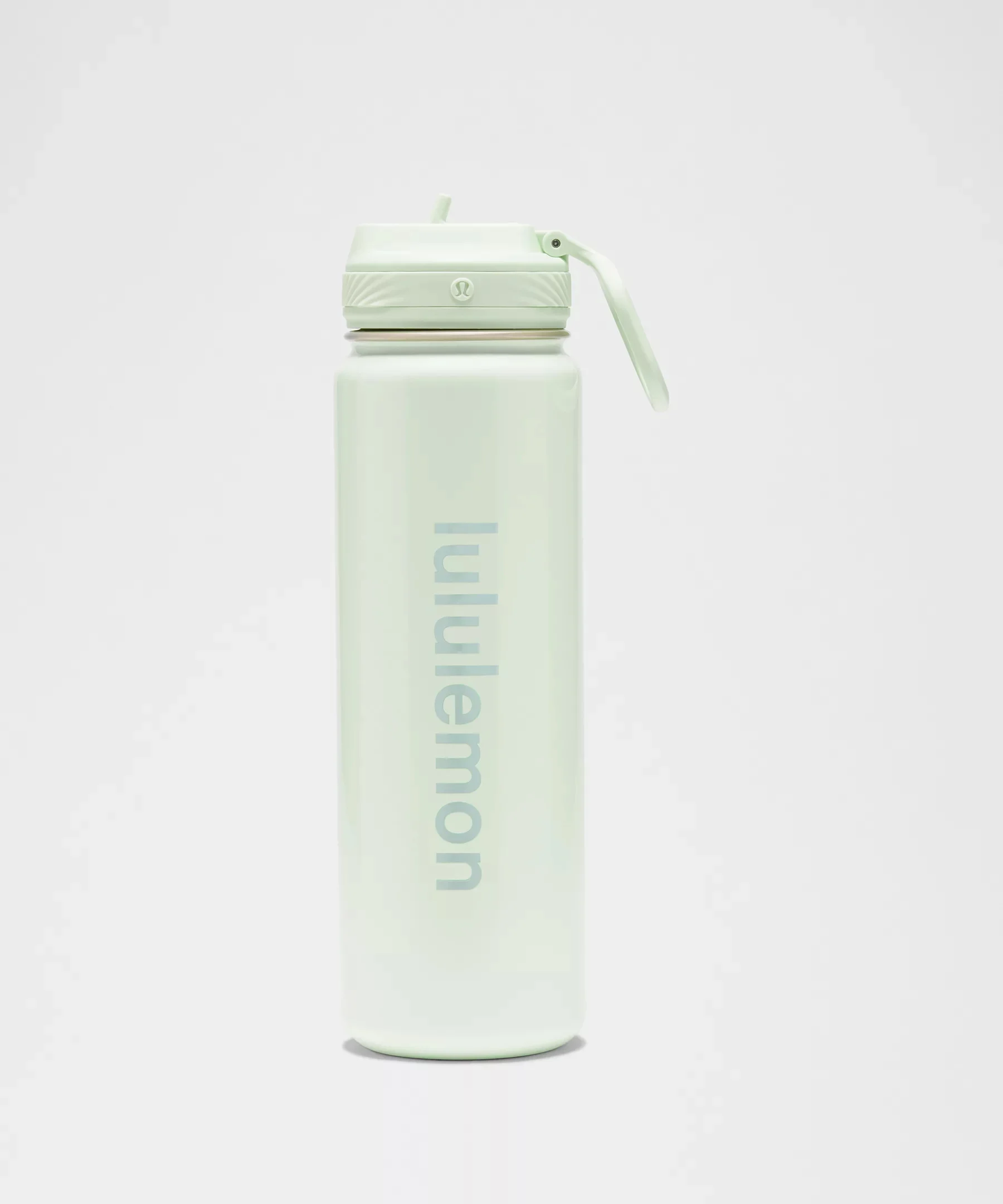 Designed for Casual Dimensions and Volume - Dimensions: 26.4cm x 7.7cm (10.4" x 3") - Volume: 24oz (710ml) Product Features - Folding straw lid for easy sipping - Double-wall design keeps bottle sweat-free - Vacuum insulation keeps drink ice cold - No-flavour transfer keeps contents tasting fresh - Care Instructions: Wash before use. Lid is dishwasher-safe on top rack only. Please hand wash the body of the bottle to preserve the finish. Do not fill with hot water - To deep clean the lid, remove the interior silicone ring and soak in a 2:1 solution of water and vinegar, or cleanse using dish soap. Do not use harsh chemicals like bleach or chlorine - To reassemble, press the ring back into the lid’s open cavity with the tab exposed. Ensure the ring is evenly pressed into the cavity before screwing the lid back on for a secure, leak-proof fit - Due to the nature of the finish, please use care when storing your bottle in bags or backpacks, and around sharp objects such as keys. Hand-wash only as finish may chip or peel in the dishwasher. Natural wear may occur over time Material and care Materials Body: 100% Steel - Band: 100% Silicone - Top: 100% Polypropylene Care Body - Hand Wash Only - Do Not Use with Hot Water - Lid - Dishwasher Top Rack - Wash Before Use