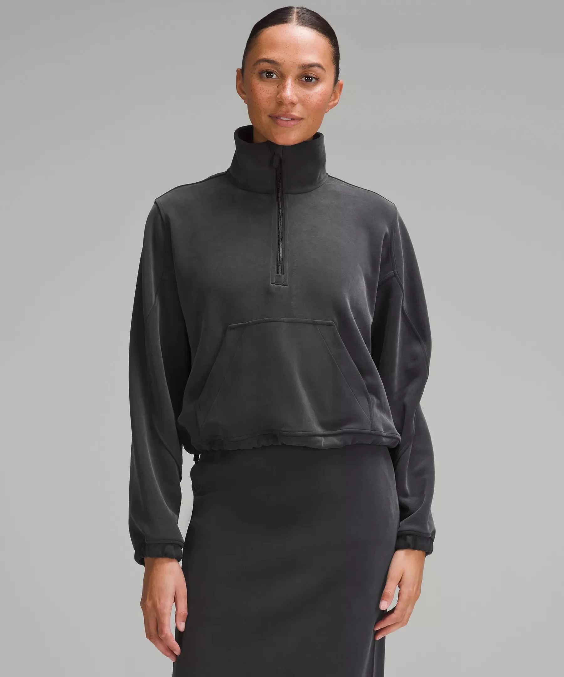 Peach-Fuzz Soft, Brushed Softstreme™ Fabric Peach-fuzz soft texture Brushed for added warmth next to skin Four-way stretch Quick-drying Weighty drape Machine washable. Water drops can easily mark this fabric—a simple wash will remove them 100% of the polyester in this product is recycled (excluding trims) Fabric is derived from responsibly sourced wood-based materials that support the protection of ancient and endangered forests Relaxed Fit, Waist Length A loose fit with a little extra room Not too short, not too long, just right around the waistband Product Features Kangaroo pocket with a hidden card sleeve Hem cinch allows you to choose your fit Material and care Materials Body: 53% Recycled polyester38% Modal9% Elastane Cuff: 53% Recycled polyester38% Lenzing® modal9% Elastane Care Wash separately Machine wash cold gentle Do not bleach Lay flat to dry Do not iron Do not dry clean Imported
