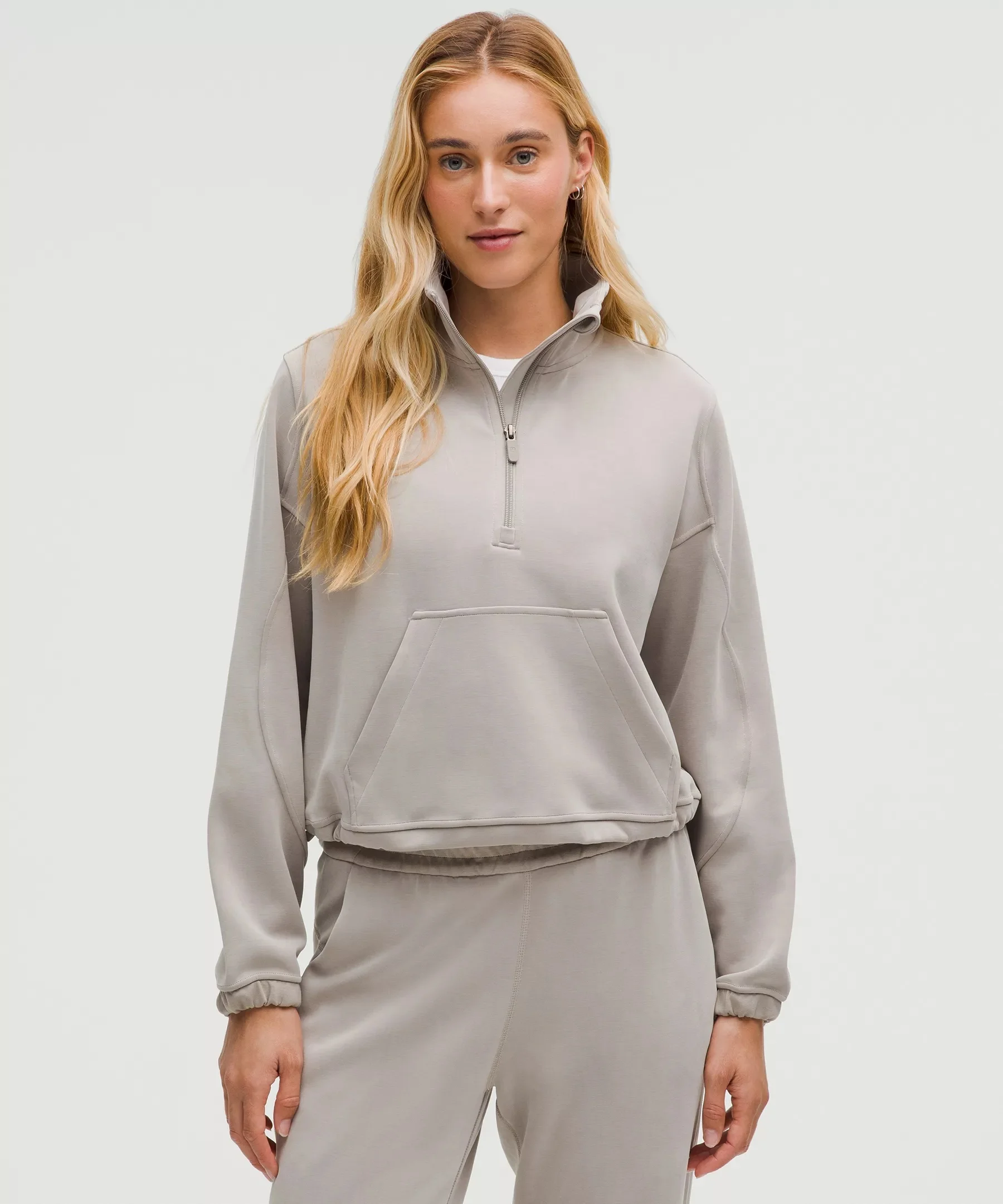 Peach-Fuzz Soft, Brushed Softstreme™ Fabric Peach-fuzz soft texture Brushed for added warmth next to skin Four-way stretch Quick-drying Weighty drape Machine washable. Water drops can easily mark this fabric—a simple wash will remove them Relaxed Fit, Waist Length A loose fit with a little extra room Not too short, not too long, just right around the waistband Product Features Kangaroo pocket with a hidden card sleeve Hem cinch allows you to choose your fit Material and care Materials Body: 53% Recycled Polyester38% Modal9% Elastane Cuff: 53% Recycled Polyester38% Modal9% Elastane Care Wash separately Machine wash cold gentle Do not bleach Lay flat to dry Do not iron Do not dry clean Imported