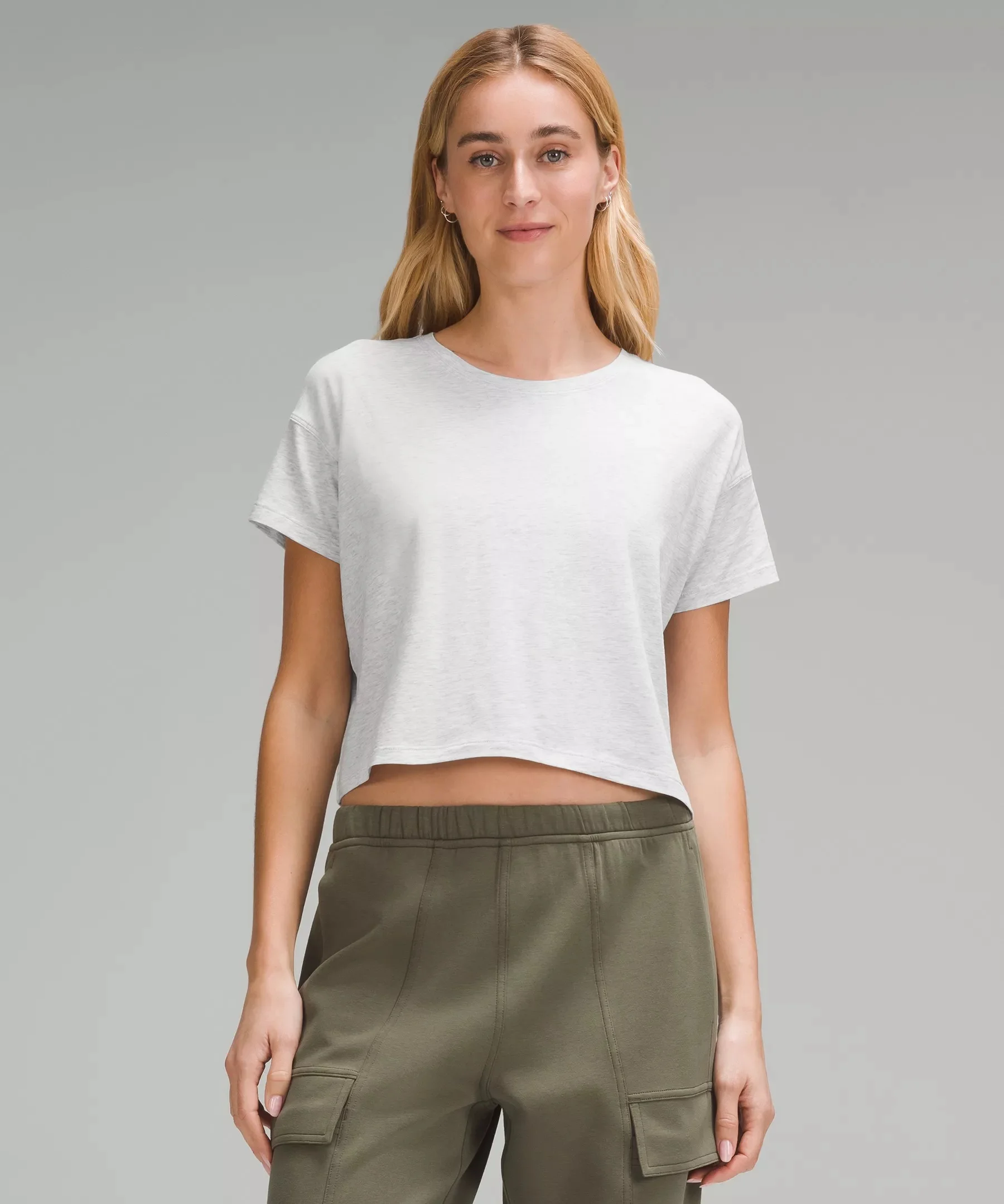 Super-Soft, Pima Cotton Fabric Soft Four-way stretch Naturally breathable Added Lycra® fibre for stretch and shape retention Relaxed Fit, Cropped Length A loose fit with a little extra room Cut above the waist—perfect with high-rise pants Care Wash with like colours Machine wash cold Do not bleach Tumble dry low Do not iron Do not dry clean Imported