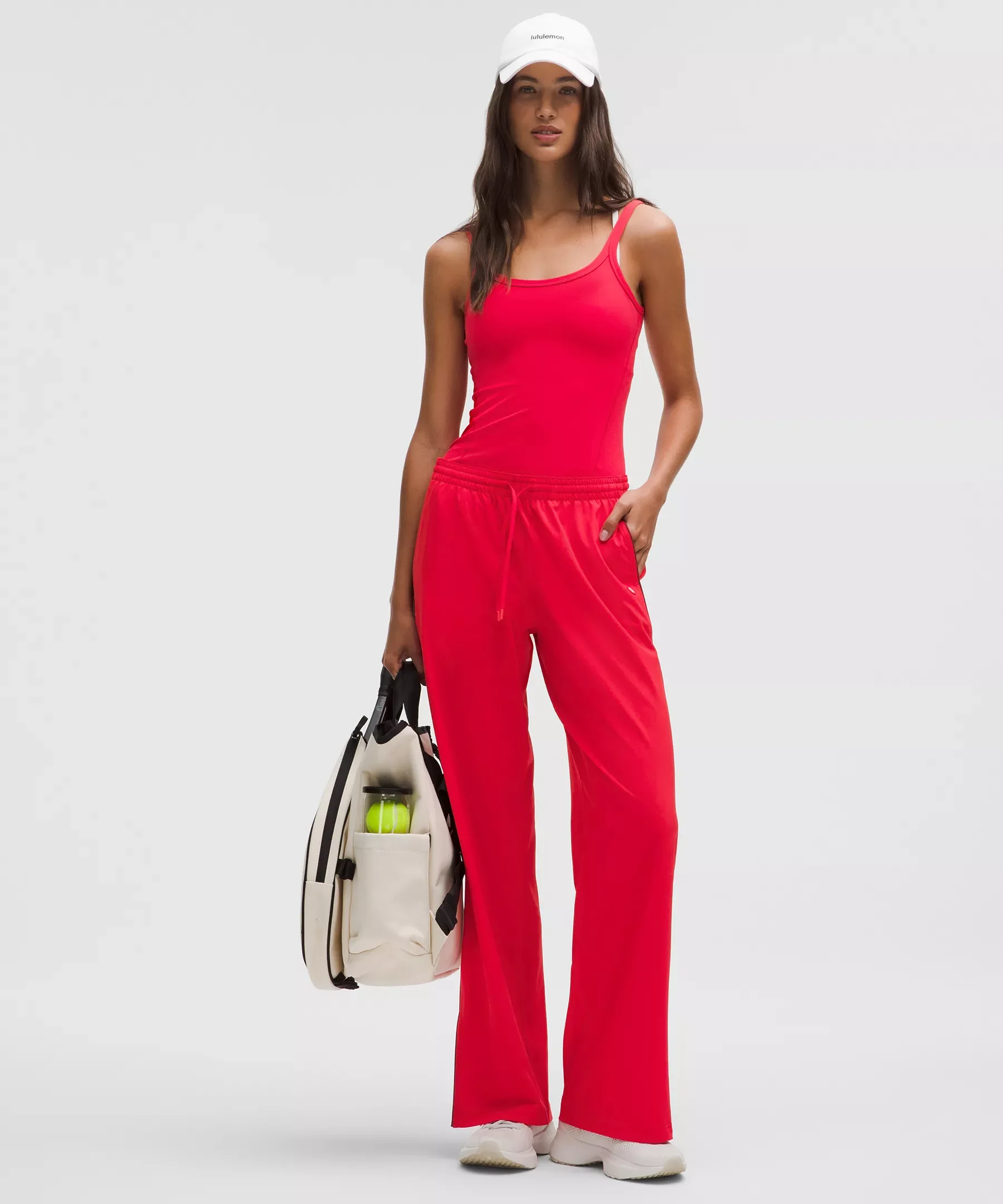 Designed for Tennis Sweat-Wicking, Swift Fabric - Sweat-wicking - Four-way stretch - Quick-drying - UV protective - UPF 40+ provides very good UV protection to only covered areas. This item's protection may be reduced with use, or if it gets stretched or wet. Sun exposure causes skin damage - This product contains recycled polyester made from repurposed plastic waste Mid Rise, Full Length - Relaxed fit is roomy through glutes and thighs - Sits away from body, hip to hem - 32" inseam, intended to sit below ankle for heights of 5'5"–5'8" Product Features - Hand pockets with hidden card sleeve - Drawcord to customize fit Material and care Materials Pocket Lining: 100% Recycled Polyester - Body: 86% Recycled Polyester14% Elastane Care Machine Wash Cold - Do Not Bleach - Tumble Dry Low - Do Not Iron - Do Not Dry Clean - Wash With Like Colors