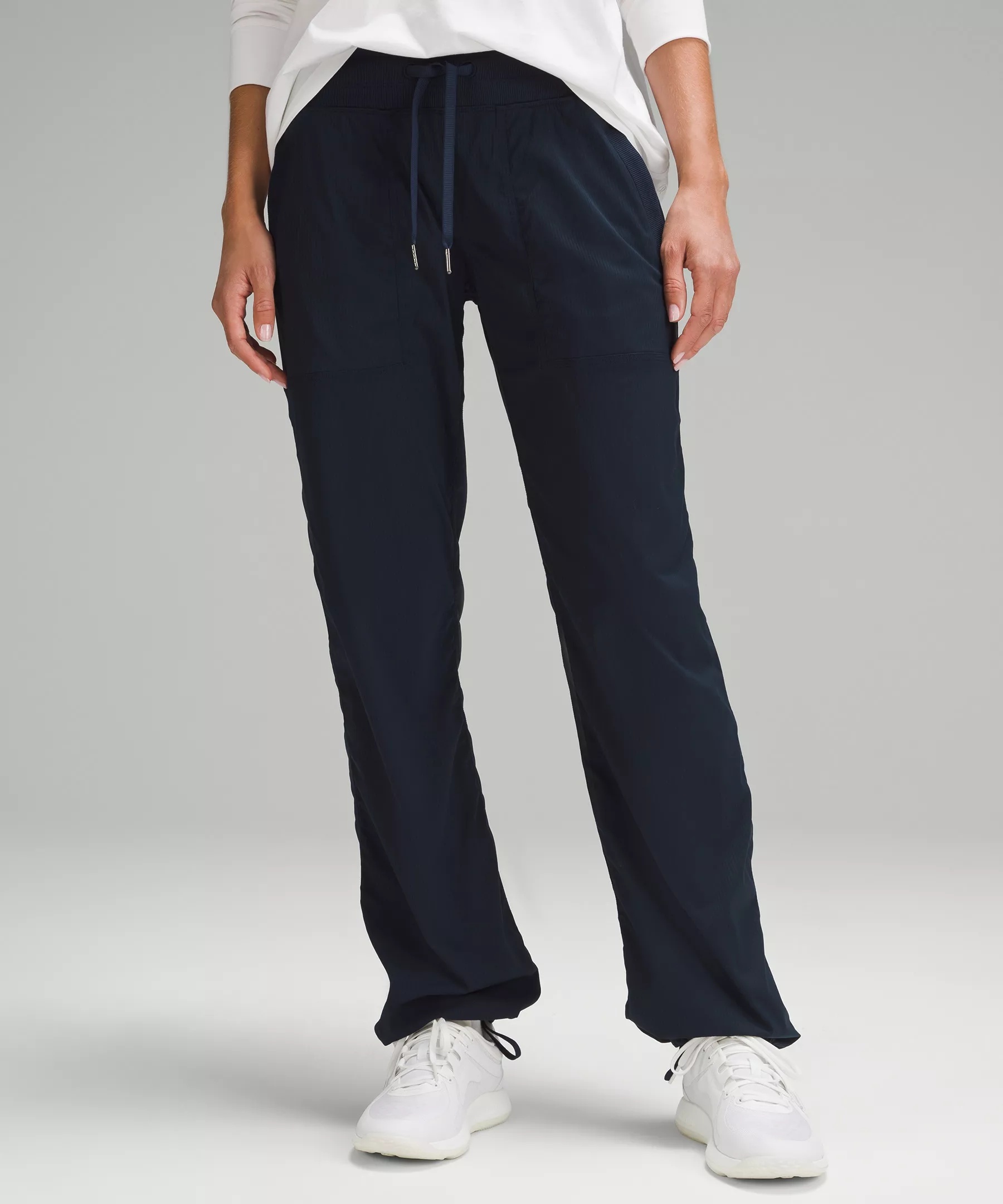 Lightweight, Swift Fabric Lightweight Two-way stretch Added Lycra® fibre for stretch and shape retention Mid Rise, Full Length Falls straight down from hip to hem Full length intended to sit at ankle Product Features Hand pockets with hidden pocket for small items Waistband drawcord helps you customize the fit Hem drawcords let you adjust the look Material and care Materials Pockets: 56% Polyester33% Coolmax® polyester11% Lycra® elastane Waistband: 88% Nylon12% Lycra® elastane Body: 94% Nylon6% Elastane Care Wash with like colours Machine wash cold Do not bleach Tumble dry low Do not iron Do not dry clean Imported