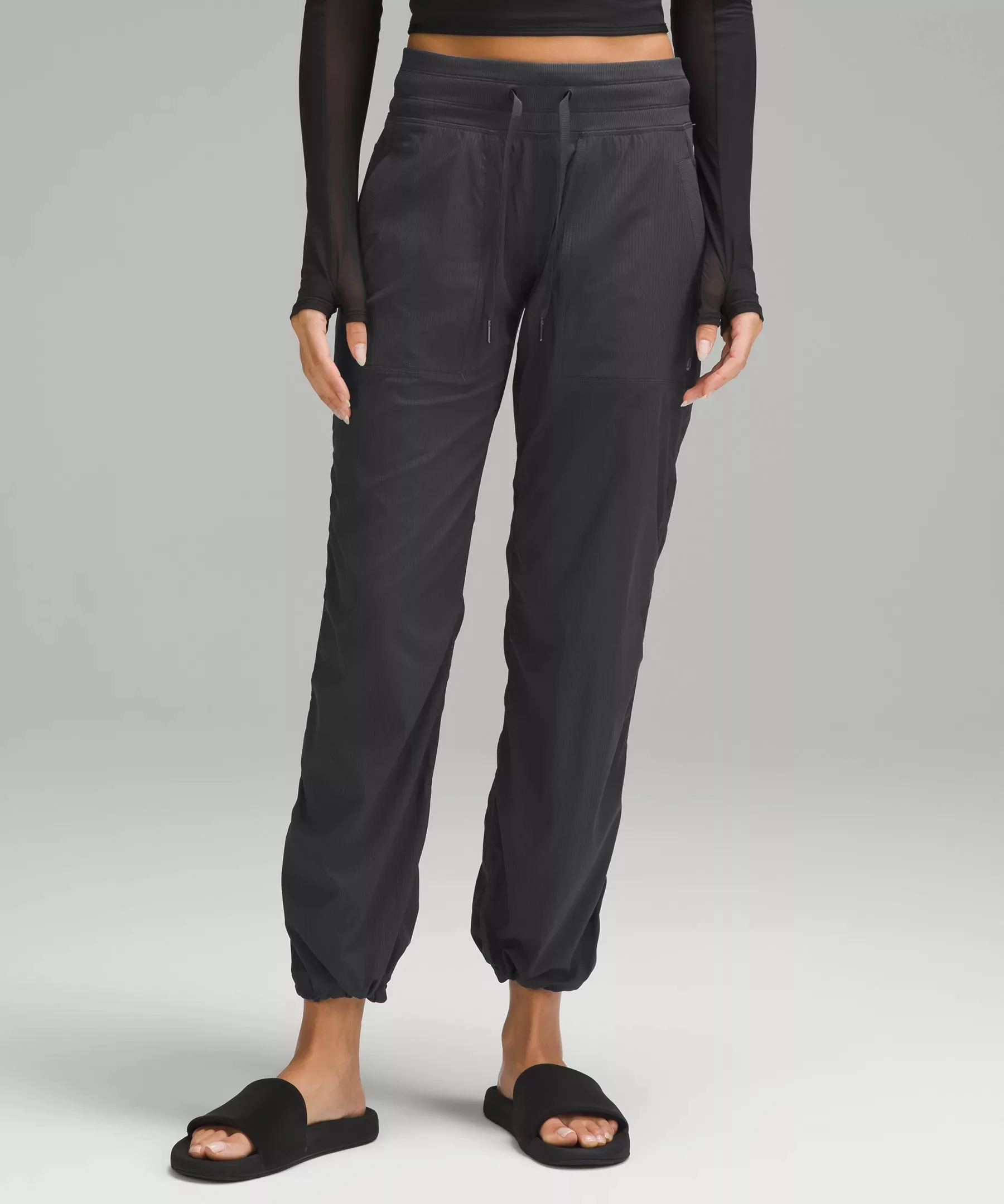 Lightweight, Swift Fabric Lightweight Two-way stretch Mid Rise, Full Length 28.5" inseam, intended to sit below the ankle for heights of 5'4" and under Product Features Waistband drawcord helps you customize the fit Hand pockets with hidden pocket for small items Hem drawcords let you adjust your look Material and care Materials Pockets: 90% Recycled polyester10% Lycra® elastane Waistband: 88% Nylon12% Lycra® elastane Body: 94% Nylon6% Elastane Care Wash with like colours Machine wash cold Do not bleach Tumble dry low Do not iron Do not dry clean Imported