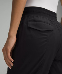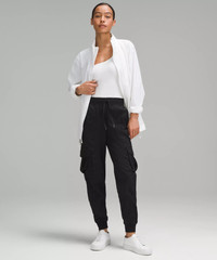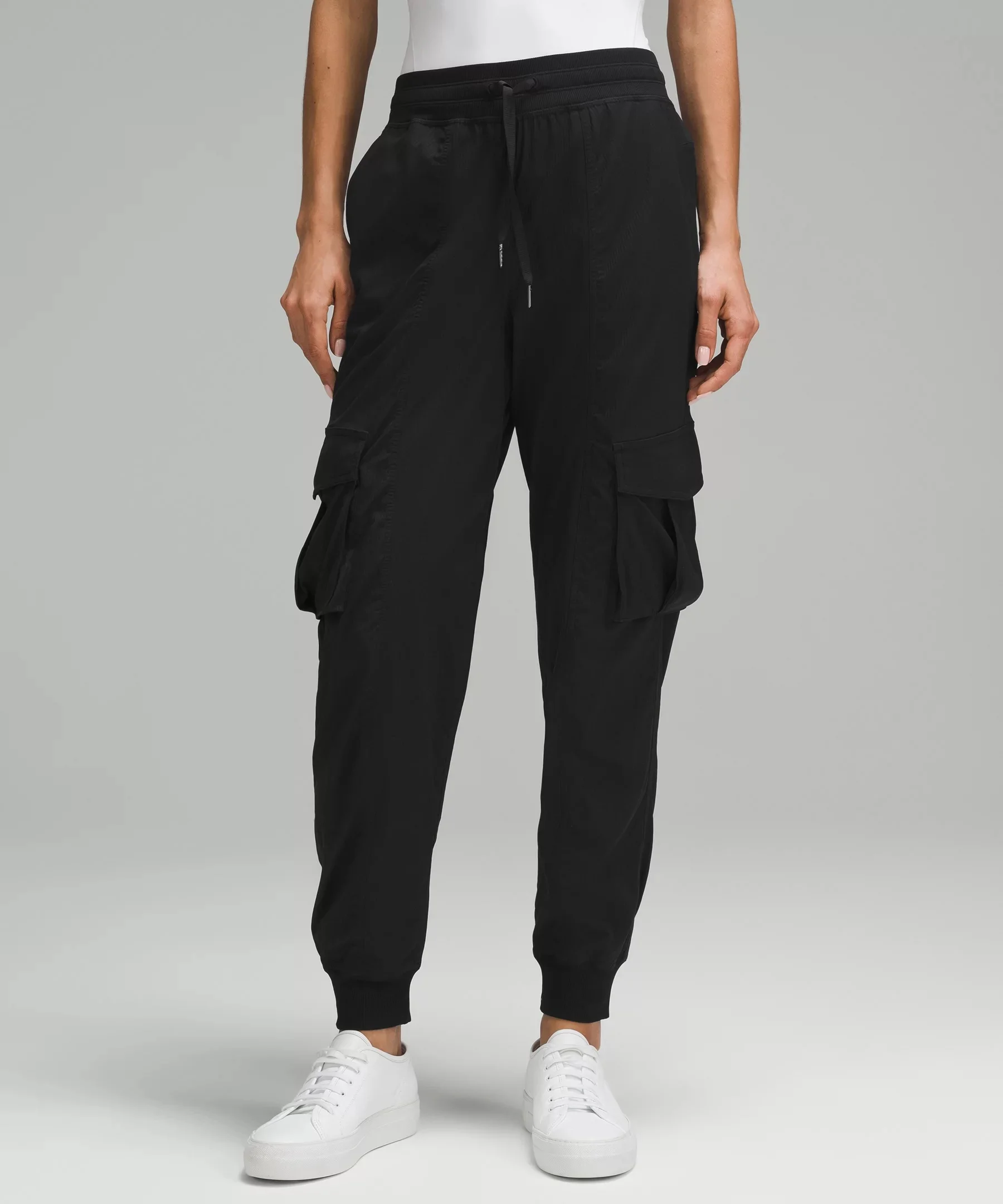 Lightweight, Swift Fabric Lightweight Water-repellent Two-way stretch Mid Rise, Full Length This new relaxed-fit version of our Dance Studio Jogger feels roomier throughout the hips and thighs. Consider sizing down for a less relaxed fit Full length intended to sit at ankle Product Features Front hand pockets with hidden zipper pocket and card sleeve Back pockets Cargo pockets Drawcord to customize fit Material and care Materials Pocket: 86% Recycled polyester14% Elastane Waistband: 88% Nylon12% Lycra® elastane Body: 94% Nylon6% Elastane Care Wash with like colours Machine wash cold Do not bleach Tumble dry low Do not iron Do not dry clean Imported