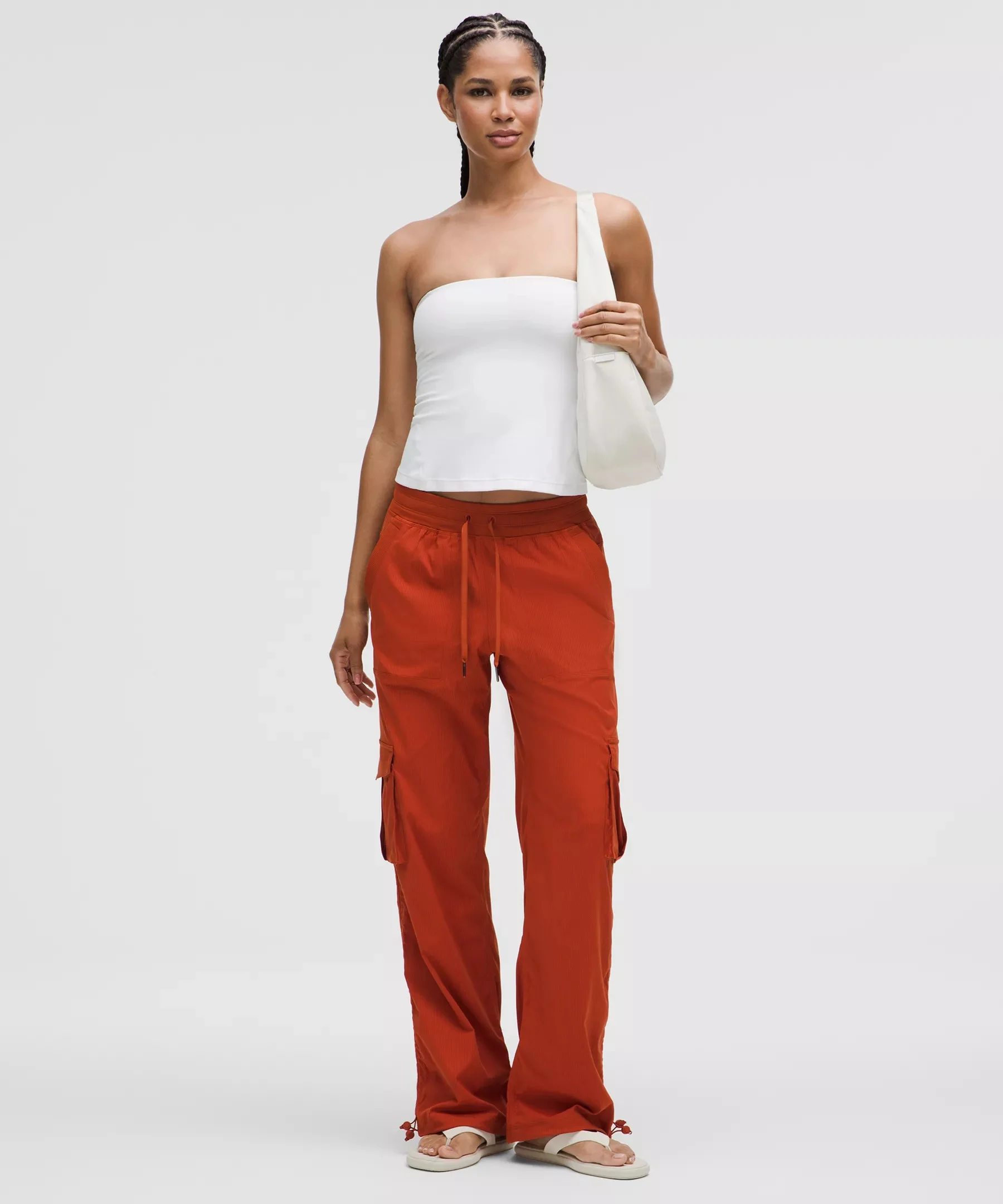 Designed for Casual Lightweight, Swift Fabric - Lightweight - Water-repellent - Two-way stretch Mid Rise, Full Length - This relaxed-fit version of our Dance Studio Pant feels roomier throughout the hips and thighs. Consider sizing down for a less relaxed fit - Full length intended to sit at ankle Product Features - Hand pockets with hidden card sleeve - Back pockets - Cargo pockets - Drawcord to customize fit - Cinchable hems let you adjust the look Material and care Materials Body: 94% Nylon6% Elastane - Waistband: 88% Nylon12% Lycra Elastane - Pocket Lining: 86% Recycled Polyester14% Elastane Care Machine Wash Cold - Do Not Bleach - Tumble Dry Low - Do Not Iron - Do Not Dry Clean - Wash With Like Colors