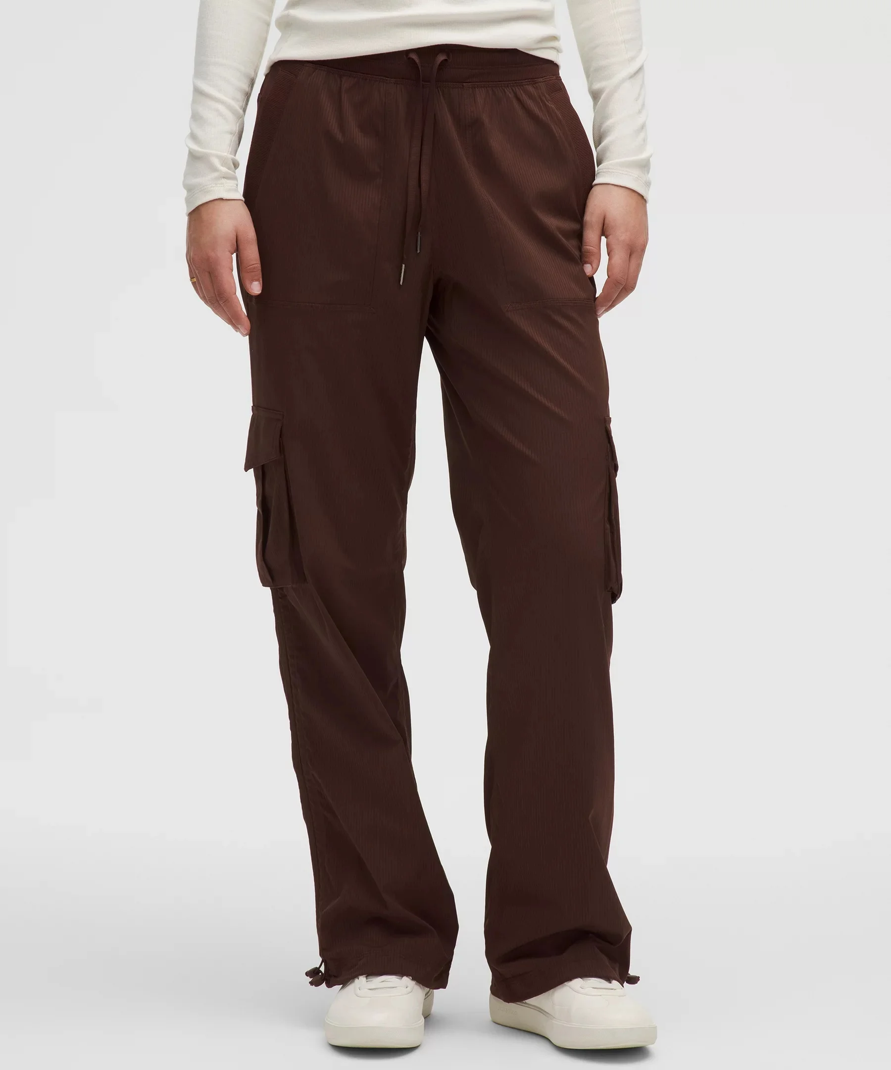Designed for Casual Lightweight, Swift Fabric - Lightweight - Water-repellent - Two-way stretch Mid Rise, Full Length - This relaxed-fit version of our Dance Studio Pant feels roomier throughout the hips and thighs. Consider sizing down for a less relaxed fit - Full length intended to sit at ankle Product Features - Hand pockets with hidden card sleeve - Back pockets - Cargo pockets - Drawcord to customize fit - Cinchable hems let you adjust the look Material and care Materials Waistband: 88% Nylon12% Lycra Elastane - Pocket: 86% Recycled Polyester14% Elastane - Body: 94% Nylon6% Elastane Care Machine Wash Cold - Do Not Bleach - Tumble Dry Low - Do Not Iron - Do Not Dry Clean - Wash With Like Colors