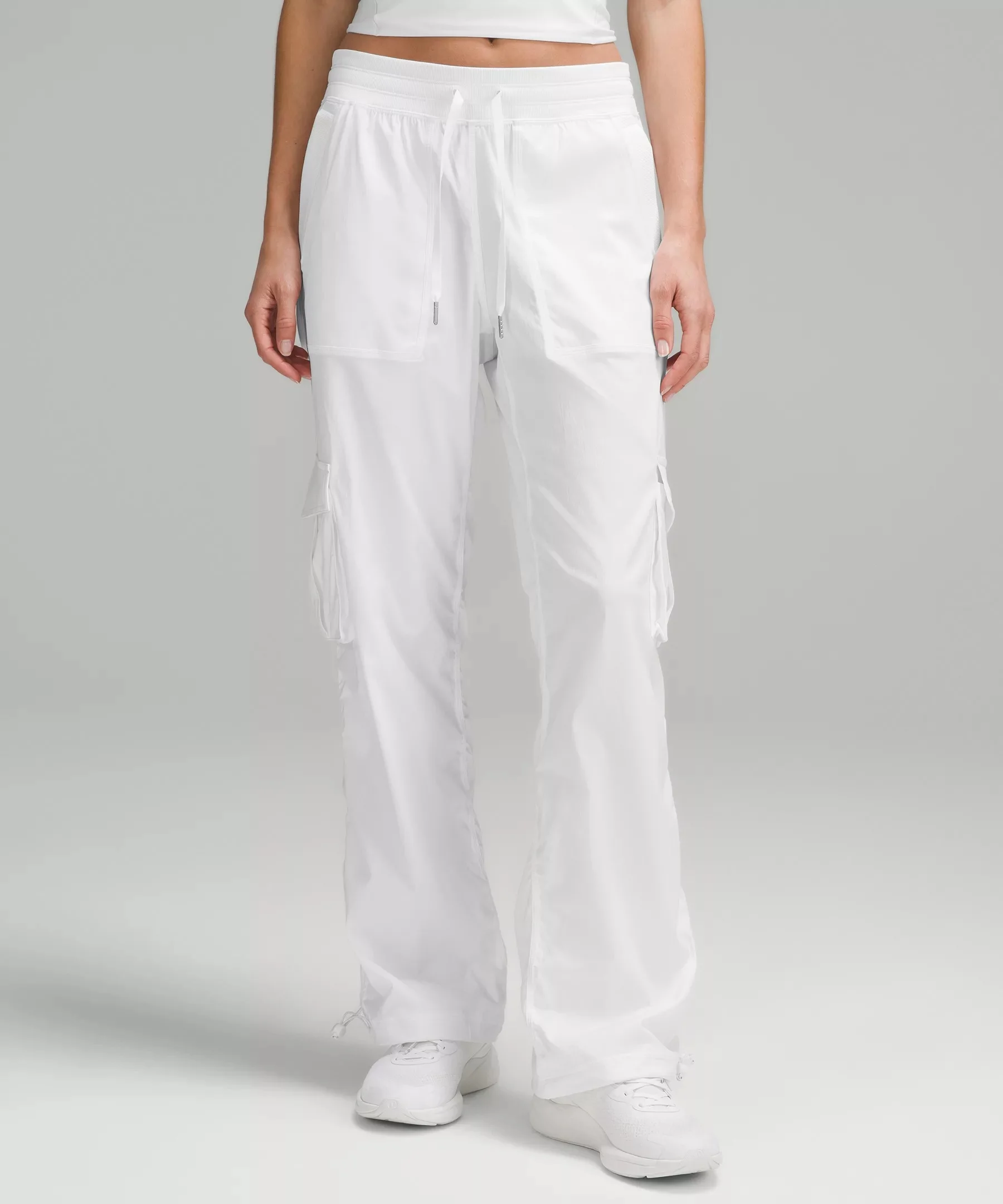 Lightweight, Swift Fabric Lightweight Water-repellent Two-way stretch Mid Rise, Full Length This new relaxed-fit version of our Dance Studio Pant feels roomier throughout the hips and thighs. Consider sizing down for a less relaxed fit Full length intended to sit at ankle Product Features Hand pockets with hidden card sleeve Back pockets Cargo pockets Drawcord to customize fit Cinchable hems let you adjust the look Material and care Materials Pocket: 86% Recycled polyester14% Elastane Waistband: 88% Nylon12% Lycra® elastane Body: 94% Nylon6% Elastane Care Wash with like colours Machine wash cold Do not bleach Tumble dry low Do not iron Do not dry clean Imported