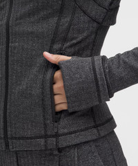 Designed for Casual Cottony-Soft Feel, Luon™ Fabric - Cottony soft - Four-way stretch - Sweat-wicking - Added Lycra® fibre for stretch and shape retention Slim Fit, Waist Length - Skims your body - Not too short, not too long, just right around the waistband Product Features - Zippered pockets - Thumbholes and Cuffins™ keep sleeves down and chills out - Locker loop for easy hanging - Elastic zipper pull doubles as an emergency hair tie Material and care Materials Body: 60% Nylon29% Polyester11% Lycra Elastane - Knuckle Side Pocket: 90% Polyester (recycled)10% Lycra Elastane Care Machine Wash Cold - Do Not Bleach - Tumble Dry Low - Do Not Iron - Do Not Dry Clean - Wash With Like Colors