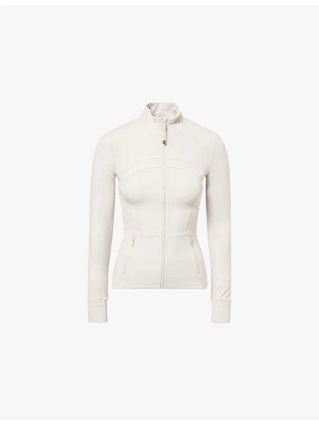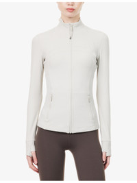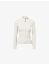 PRODUCT DETAILS - lululemon stretch-woven jacket - 81% nylon, 19% elastane; lining 89% polyester, 11% elastane - Exposed zip fastening at front - Slim fit, high neck, long sleeves, thumbholes, two zip pockets at front, exposed seams, brand print at back - Machine wash at 30°C - True to size - Model is 5ft 10in/1.78m and wears a size UK 8 - Lightweight, stretchy Ref: R04567742