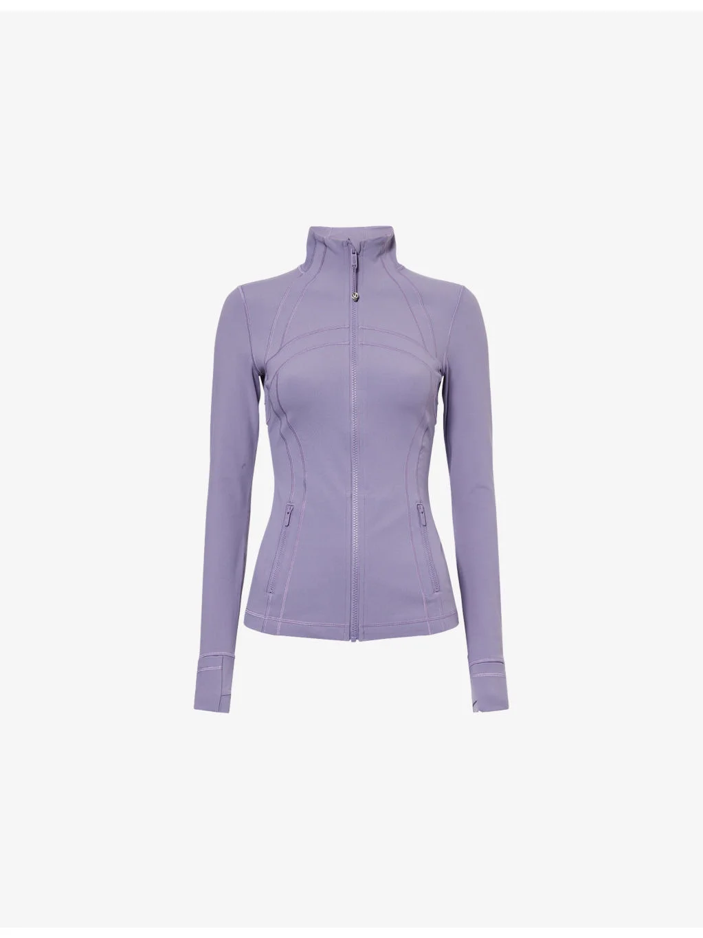 PRODUCT DETAILS - lululemon stretch-woven jacket - 81% nylon, 19% elastane; lining 89% polyester, 11% elastane - Exposed zip fastening at front - Slim fit, high neck, long sleeves, thumbholes, two zip pockets at front, exposed seams, brand print at back - Machine wash at 30°C - True to size - Model is 5ft 10in/1.78m and wears a size UK 8 - Lightweight, stretchy Ref: R04567759