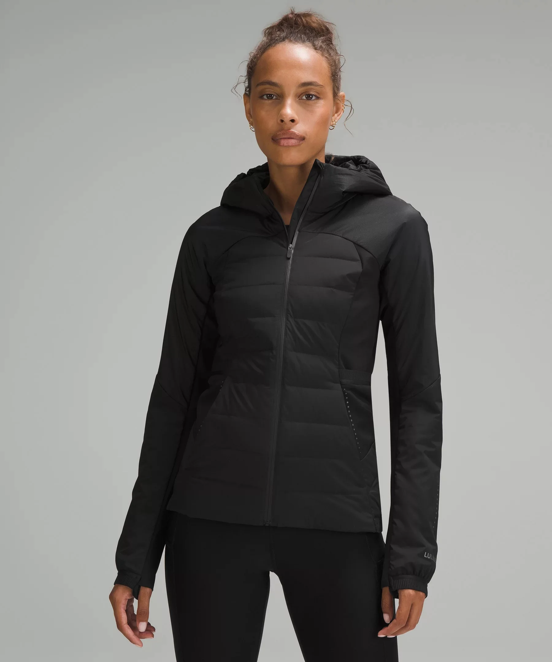 Water-Resistant, Glyde™ Fabric Water-resistant Windproof Four-way stretch, water-repellent tech fleece fabric is brushed for warmth PrimaLoft® insulation in the hood, shoulders, and sleeves stays warm even when wet Main body is filled with 700-fill-power goose down for lightweight warmth at your core 100% of our down is certified to the Responsible Down Standard (RDS) by Control Union (No. 847515) Slim Fit, Hip Length Slim fit skims your body Product Features Zippered exterior pockets with a hidden phone sleeve Thumbholes Reflective details Material and care Materials Body filling: 85% Grey goose down15% Grey Goose Feathers Side panels: 82% Nylon18% Lycra® elastane Hood and sleeve filling: 75% Recycled polyester25% Polyester Sleeves: 82% Nylon18% Lycra® elastane Trim filling: 100% Recycled polyester Upper panel: 100% Nylon Lining: 90% Nylon10% Elastane Hood and sleeve lining: 100% Nylon Body: 90% Nylon10% Elastane Hood: 100% Nylon Care Wash with like colours Machine wash cold Do not bleach Tumble dry low Do not iron Do not dry clean Imported