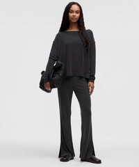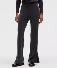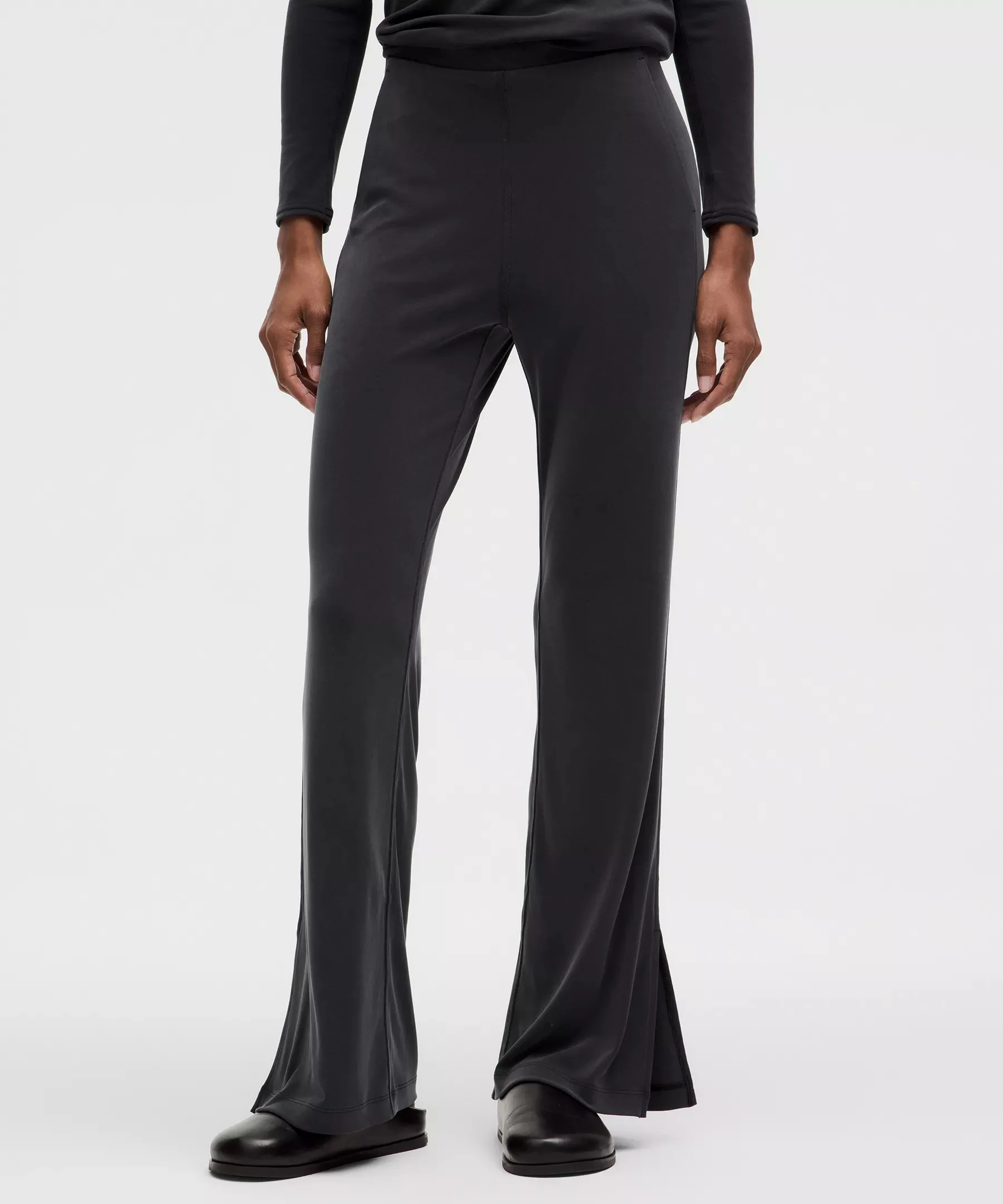 Ultra-Stretchy, Drapey Softstreme™ Fabric Fluid drape Ultra-stretchy Quick-drying Light feel Soft on both sides Four-way stretch Machine washable. Water drops can easily mark this fabric—a simple wash will remove them 100% of the polyester in this product is recycled (excluding trims) Fabric is derived from wood-based materials from well-managed forests High Rise, Full Length Slim fit skims your body Flares out from the knee to hem Full length intended to puddle at the shoes Product Features Hand pockets Elastic waistband Side slits at the hems Material and care Materials Pocket Lining: 86% Recycled Polyester14% Elastane Body: 58% Modal39% Recycled Polyester3% Elastane Care Wash separately Machine wash cold gentle Do not bleach Lay flat to dry Do not iron Do not dry clean Imported