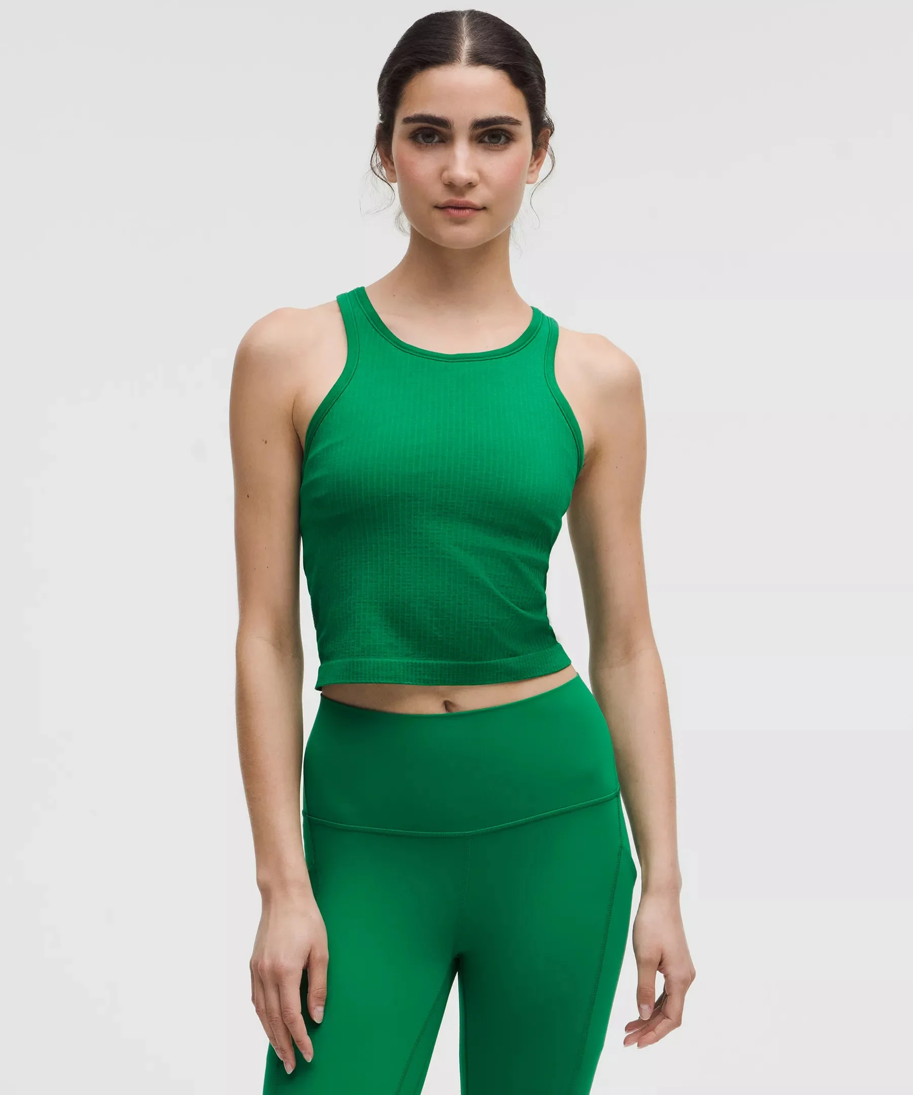 Designed for Yoga and Casual Skip-the-Chafe, Seamless Construction - Minimal seams to reduce chafe - Sweat-wicking - Four-way stretch Light Support, B/C Cups - Intended to provide light support for B/C cups - Tight fit contours your body - Cropped length is cut above the waist—perfect with high-rise pants - Intended for low-impact activities Product Features - Built-in shelf bra for added support and coverage - Pockets for optional, removable cups - Racerback shape allows for full range of movement Material and care Materials Body: 100% Nylon - Bra: 88% Nylon12% Elastane - Bra Lining: 93% Nylon7% Elastane Care Machine Wash Cold - Do Not Bleach - Tumble Dry Low - Do Not Iron - Do Not Dry Clean - Wash With Like Colors