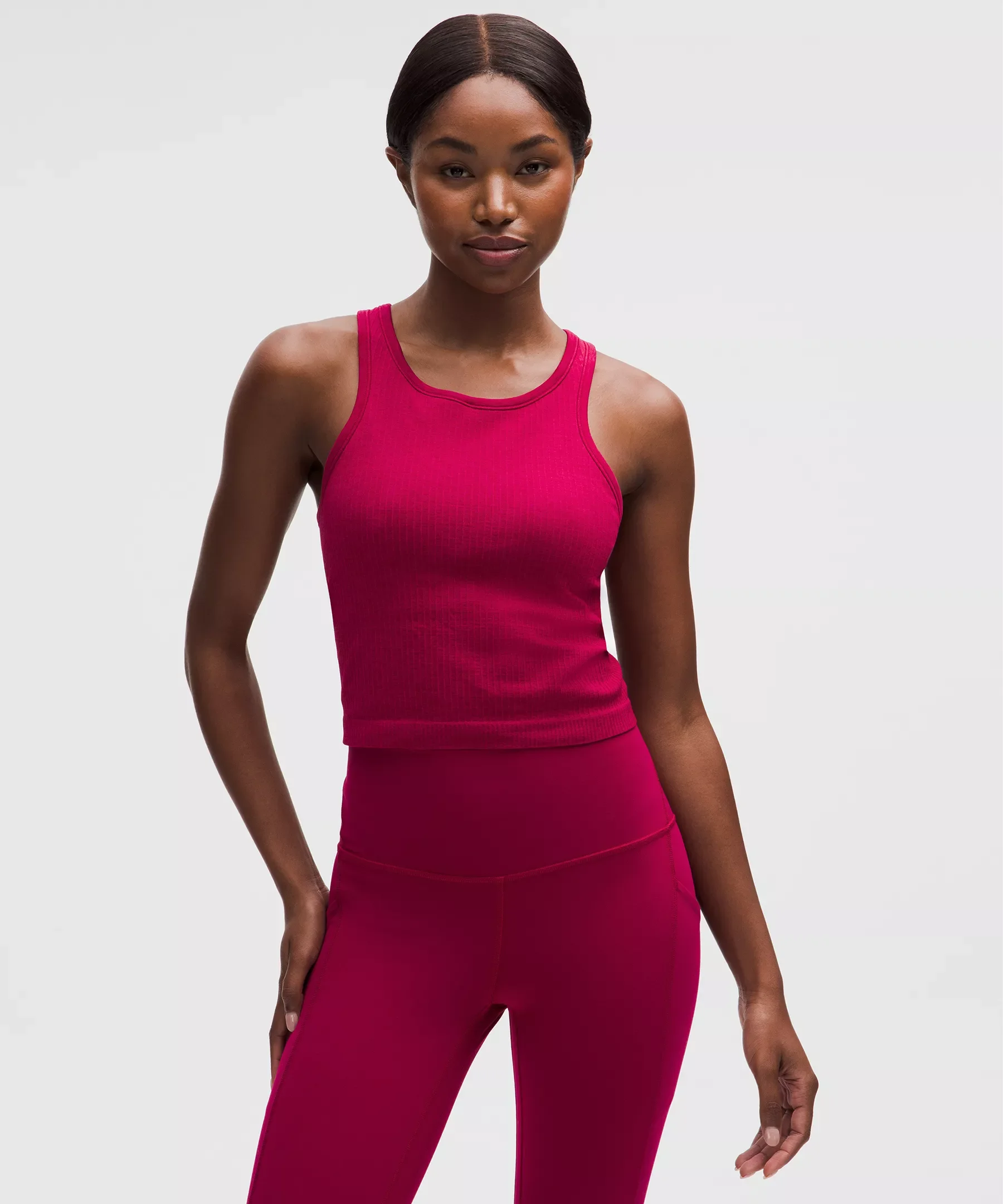 Designed for Yoga Skip-the-Chafe, Seamless Construction - Minimal seams to reduce chafe - Sweat-wicking - Four-way stretch Light Support, B/C Cups - Intended to provide light support for B/C cups - Tight fit contours your body - Cropped length is cut above the waist—perfect with high-rise pants - Intended for low-impact activities Product Features - Built-in shelf bra for added support and coverage - Pockets for optional, removable cups - Racerback shape allows for full range of movement Material and care Materials Body: 100% Nylon - Bra: 88% Nylon12% Elastane - Bra Lining: 93% Nylon7% Elastane Care Machine Wash Cold - Do Not Bleach - Tumble Dry Low - Do Not Iron - Do Not Dry Clean - Wash With Like Colors
