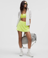 Designed for Tennis Lightweight, Swift Fabric - Lightweight - Four-way stretch - Sweat-wicking - Quick-drying - Built-in Luxtreme™ fabric liner is sweat-wicking and four-way stretch with a cool, smooth feel - Added Lycra® fibre for stretch and shape retention Fit Information - High rise - Skirt length is measured at the centre front, from the top of the waistband to the hem - Skirt length by size: 0–2: 13", 4–6: 13.5", 8–10: 14", 12–14: 14.5" - Liner length for all sizes: 3.5” Product Features - Continuous drawcord - Drop-in pockets on the liner - Silicone grippers on the hem prevent ride-up - Built-in liner offers extra coverage Material and care Materials Waistband: 78% Nylon22% Elastane - Front Lining: 87% Nylon13% Lycra Elastane - Back Lining: 69% Nylon31% Lycra Elastane - Body: 86% Polyester (recycled)14% Elastane Care Machine Wash Cold - Do Not Bleach - Tumble Dry Low - Do Not Iron - Do Not Dry Clean - Wash With Like Colors