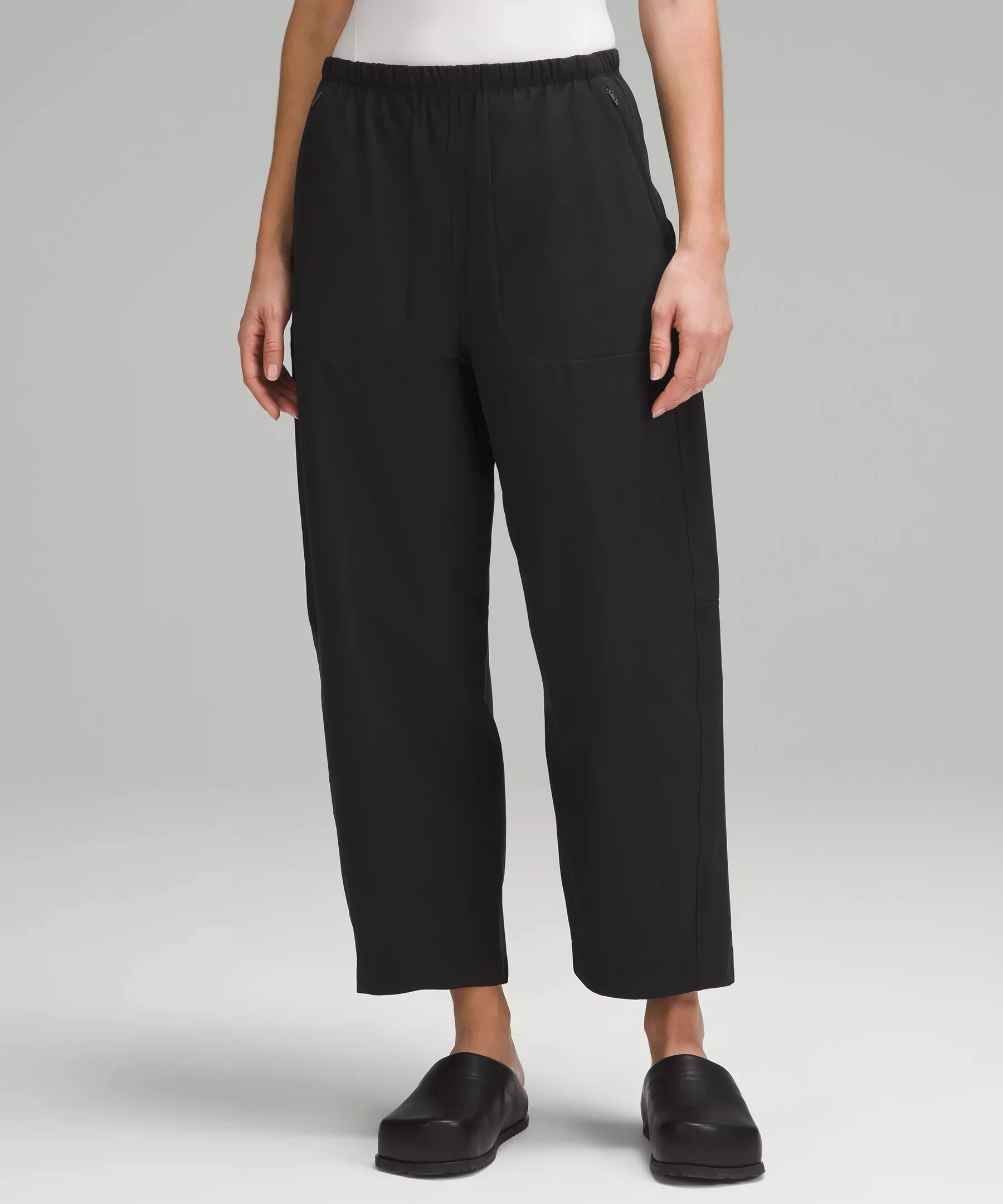 Lightweight, Swift Fabric Lightweight Water-repellent Windproof This product contains recycled nylon made from repurposed plastic waste Mid Rise, Cropped Length Intended to sit above ankle Relaxed fit is roomy through glutes and thighs Product Features Zippered hand pockets with hidden card sleeve Elastic waistband Material and care Materials Pockets: 86% Recycled polyester14% Elastane Body: 65% Recycled nylon30% Nylon5% Elastane Care Wash with like colours Machine wash cold Do not bleach Tumble dry low Do not iron Do not dry clean Imported