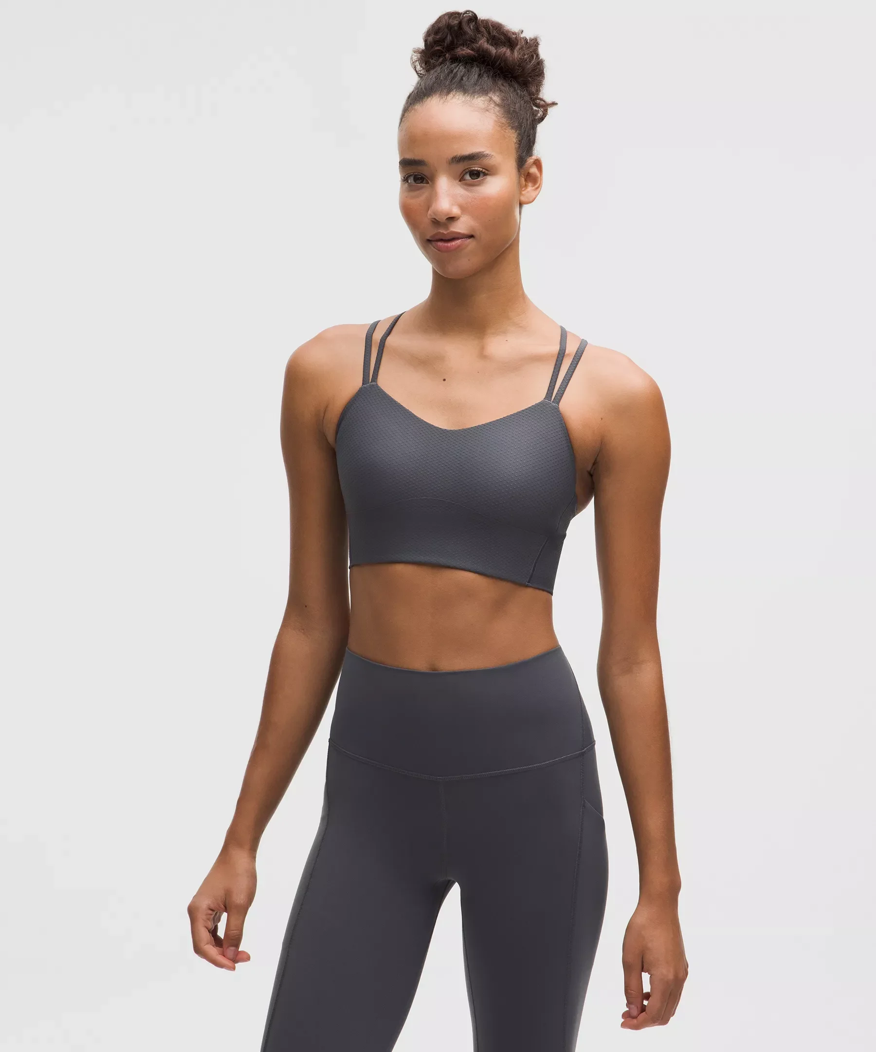 Designed for Yoga and Casual Soft, Sweat-Wicking Fabric - Sweat-wicking - Soft - Quick-drying - Four-way stretch - Tiny polka dot pattern - Our jacquard technique creates fabric with a rich texture - 100% of the polyester and nylon in this product is recycled (excluding trims) Light Support, B/C Cups - Intended for low-impact activities Product Features - Moulded foam cups are lightweight and malleable Material and care Materials Cup: Cup Shell: 100% PolyesterCup Foam: 100% Polyurethane - Lining: 75% Nylon (recycled)25% Elastane - Body: 67% Nylon (recycled)33% Elastane Care Machine Wash Cold - Do Not Bleach - Tumble Dry Low - Do Not Iron - Do Not Dry Clean - Wash With Like Colors