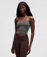 Feels Buttery-Soft and Weightless, Nulu™ Fabric So buttery soft, it feels weightless Four-way stretch Sweat-wicking Breathable Added Lycra® fibre for stretch and shape retention Light Support, A/B Cups Intended to provide light support for A/B cups Tight fit contours your body Cropped length is cut above the waist—perfect with high-rise pants Intended for low-impact activities Product Features Built-in shelf bra for added support and coverage Pockets for optional, removable cups Adjustable straps Material and care Materials Middle Layer: 89% Nylon11% Elastane Body: 81% Nylon19% Lycra Elastane Bra Lining: 81% Nylon19% Lycra Elastane Care Wash with like colours Machine wash cold Do not bleach Tumble dry low Do not iron Do not dry clean Imported