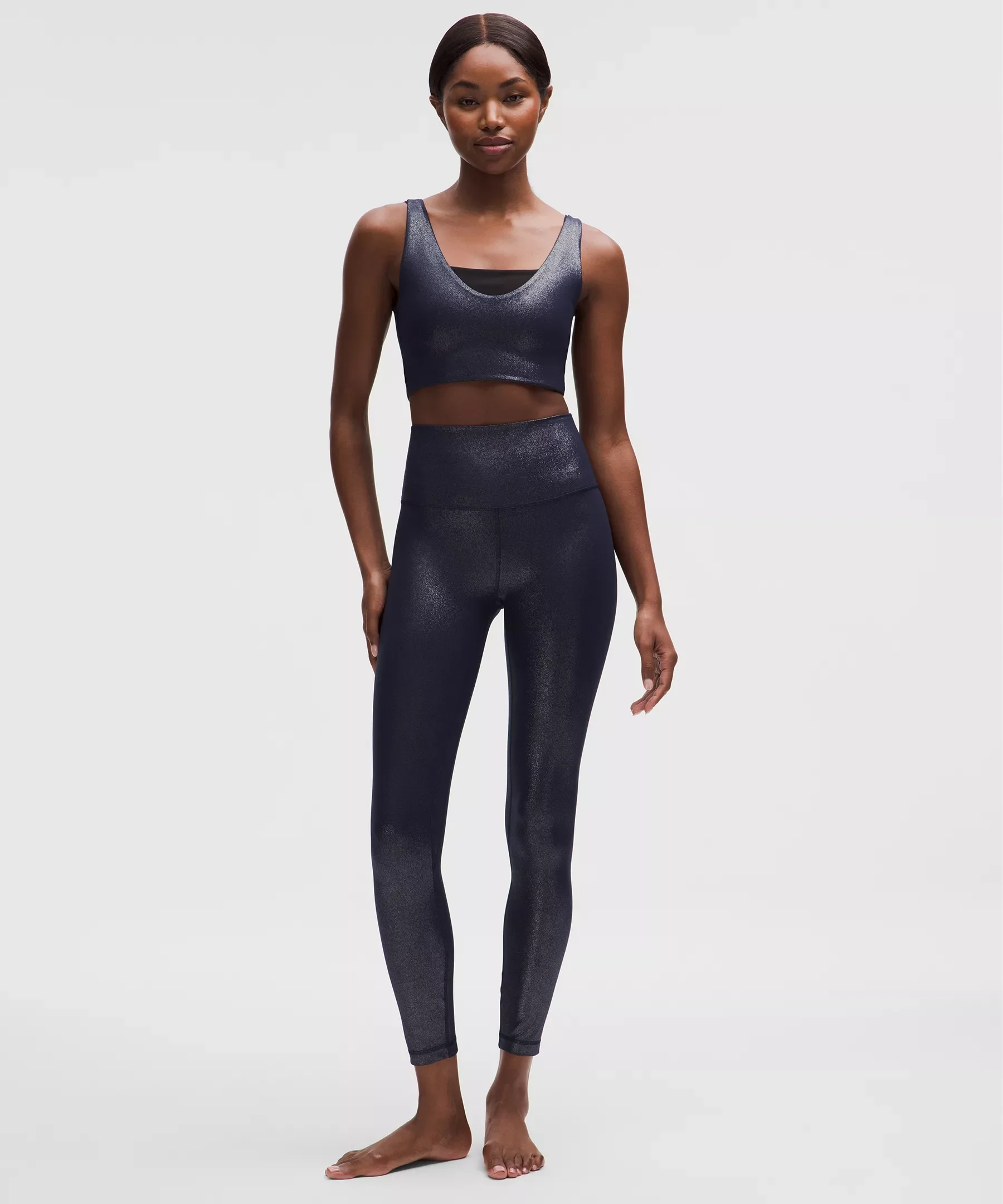 Designed for Yoga Feels Buttery-Soft and Weightless, Nulu™ Fabric - So buttery soft, it feels weightless - Four-way stretch - Sweat-wicking - Breathable - Added Lycra® fibre for stretch and shape retention - Over time the shiny details will take on their own well-loved look High Rise, 25" Length - Intended to sit above ankle Product Features - Hidden waistband pocket fits a card or key, and won’t get in your way - This collection’s great for low-impact workouts like yoga or whenever you want to feel really, really comfortable Material and care Materials Body: 81% Nylon19% Lycra Elastane Care Wash With Like Colors - Do Not Bleach - Line Dry - Do Not Iron - Do Not Dry Clean - Wash With Like Colors