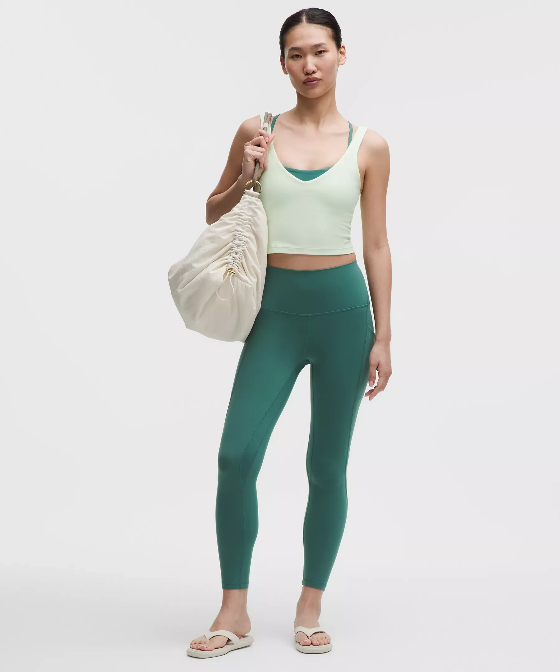 Designed for Yoga Feels Buttery-Soft and Weightless, Nulu™ Fabric - So buttery soft, it feels weightless - Four-way stretch - Sweat-wicking - Breathable - Added Lycra® fibre for stretch and shape retention High Rise, 25" Length - Intended to sit above ankle Product Features - Side drop-in pockets - Back drop-in pocket can hold a key, card, or phone - This collection’s great for low-impact workouts like yoga or whenever you want to feel really, really comfortable Material and care Materials Body: 81% Nylon19% Lycra Elastane Care Machine Wash Cold - Do Not Bleach - Tumble Dry Low - Do Not Iron - Do Not Dry Clean - Wash With Like Colors