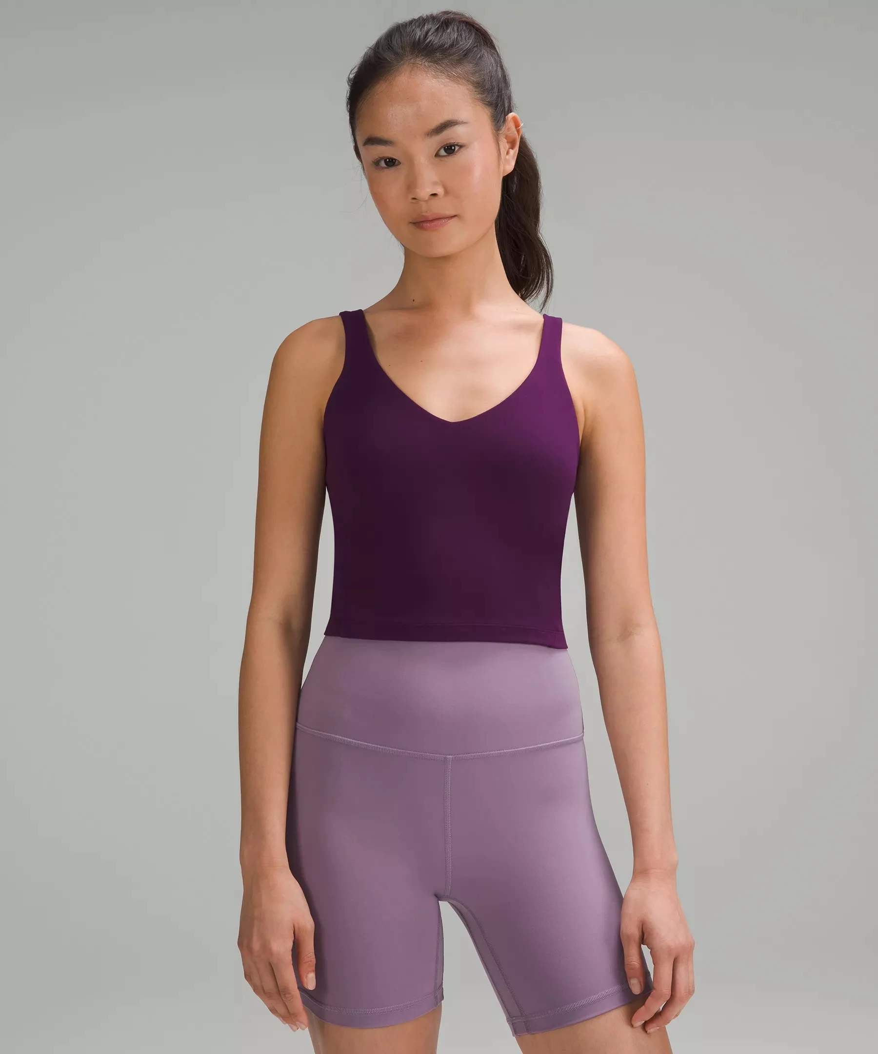 Feels Buttery-Soft and Weightless, Nulu™ Fabric So buttery soft, it feels weightless Four-way stretch Sweat-wicking Breathable Added Lycra® fibre for stretch and shape retention Light Support Sizes 0-14 fit A/B cups Sizes 16-20 fit C/D cups Tight fit contours your body Cropped length is cut above the waist—perfect with high-rise pants Light support is intended for low-impact activities Product Features Built-in shelf bra for added support and coverage Pockets for optional, removable cups Material and care Materials Middle layer: 89% Nylon11% Elastane Body: 81% Nylon19% Lycra® elastane Liner: 81% Nylon19% Lycra® elastane Care Wash with like colours Machine wash cold Do not bleach Tumble dry low Do not iron Do not dry clean Imported