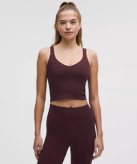 Designed for Yoga Feels Buttery-Soft and Weightless, Nulu™ Fabric - So buttery soft, it feels weightless - Four-way stretch - Sweat-wicking - Breathable - Added Lycra® fibre for stretch and shape retention Light Support - Sizes 0-14 fit A/B cups - Sizes 16-20 fit C/D cups - Tight fit contours your body - Cropped length is cut above the waist—perfect with high-rise pants - Intended for low-impact activities Product Features - Built-in shelf bra for added support and coverage - Pockets for optional, removable cups Material and care Materials Middle Layer: 89% Nylon11% Elastane - Body: 81% Nylon19% Lycra Elastane - Bra Lining: 81% Nylon19% Lycra Elastane Care Machine Wash Cold - Do Not Bleach - Tumble Dry Low - Do Not Iron - Do Not Dry Clean - Wash With Like Colors