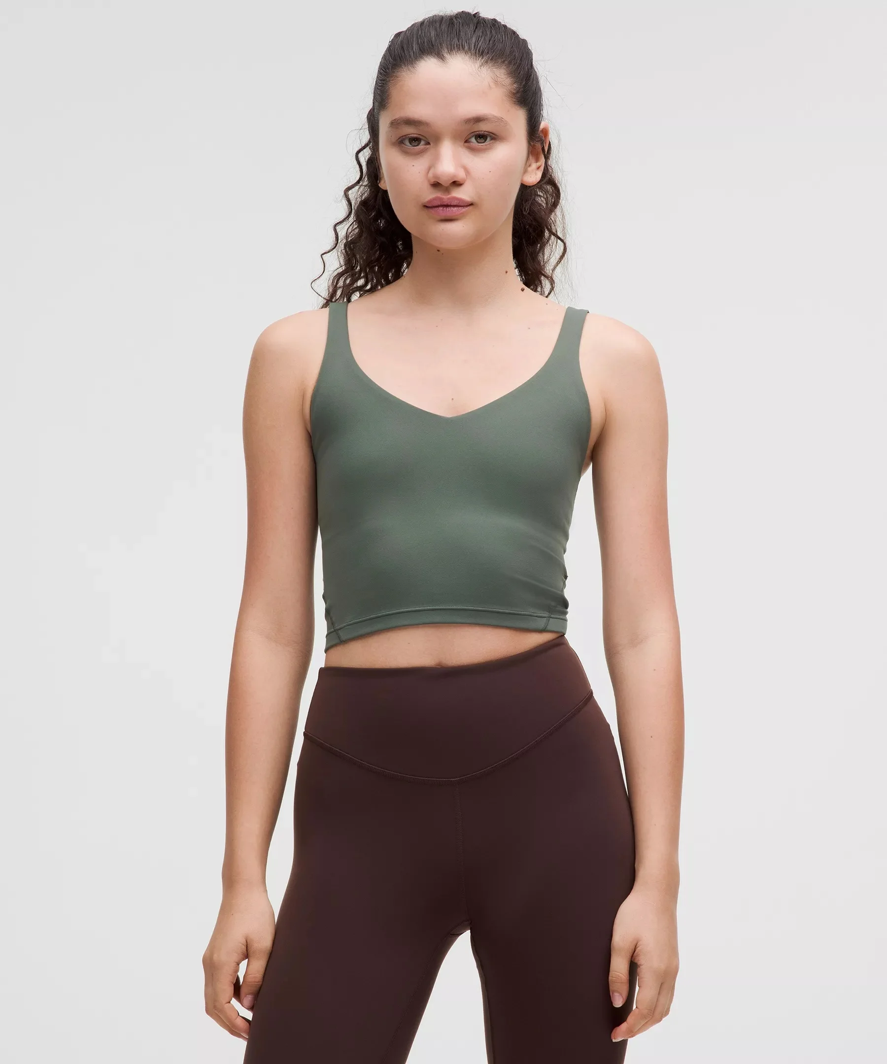Feels Buttery-Soft and Weightless, Nulu™ Fabric So buttery soft, it feels weightless Four-way stretch Sweat-wicking Breathable Added Lycra® fibre for stretch and shape retention Light Support Sizes 0-14 fit A/B cups Sizes 16-20 fit C/D cups Tight fit contours your body Cropped length is cut above the waist—perfect with high-rise pants Light support is intended for low-impact activities Product Features Built-in shelf bra for added support and coverage Pockets for optional, removable cups Material and care Materials Middle Layer: 89% Nylon11% Elastane Body: 81% Nylon19% Lycra Elastane Liner: 81% Nylon19% Lycra Elastane Care Wash with like colours Machine wash cold Do not bleach Tumble dry low Do not iron Do not dry clean Imported